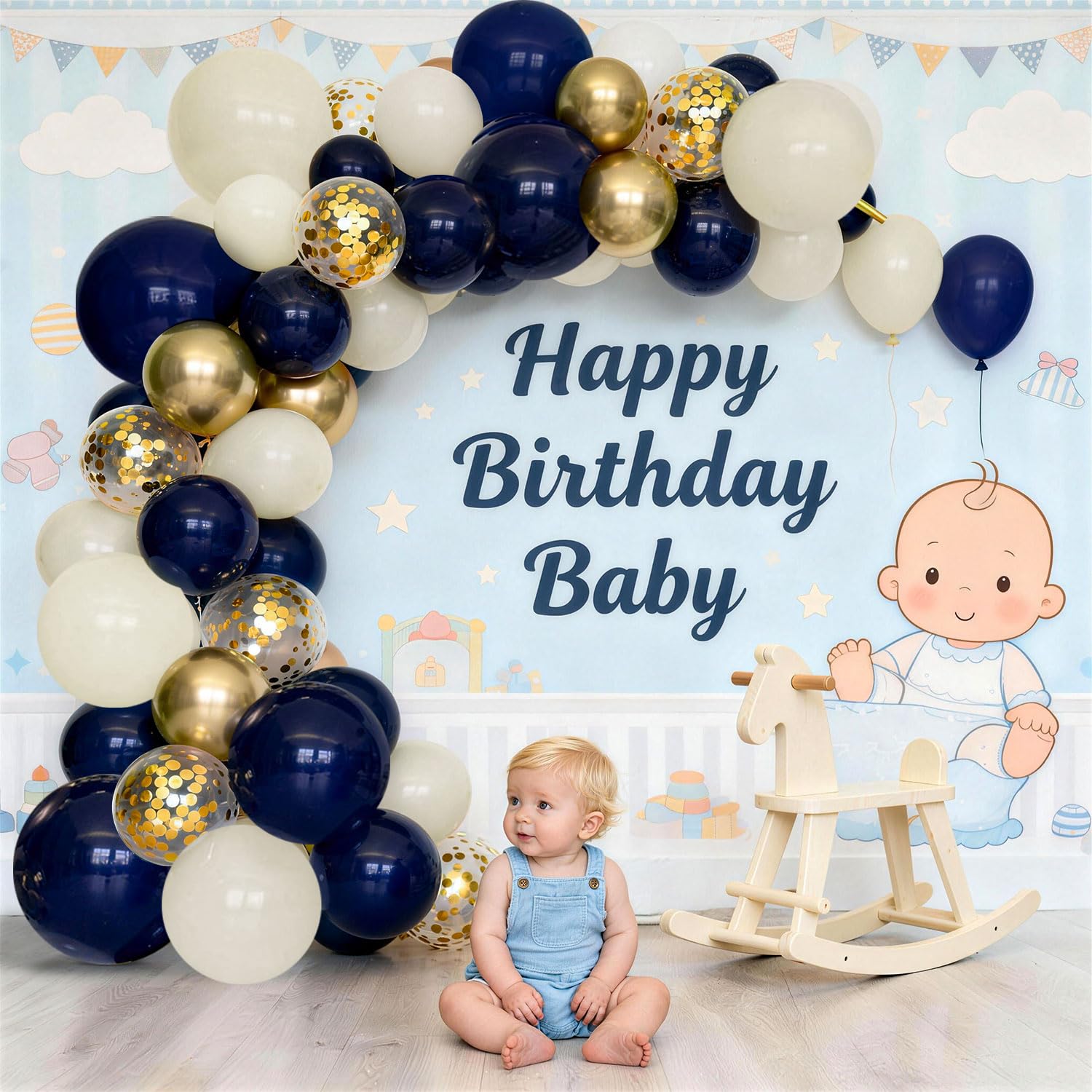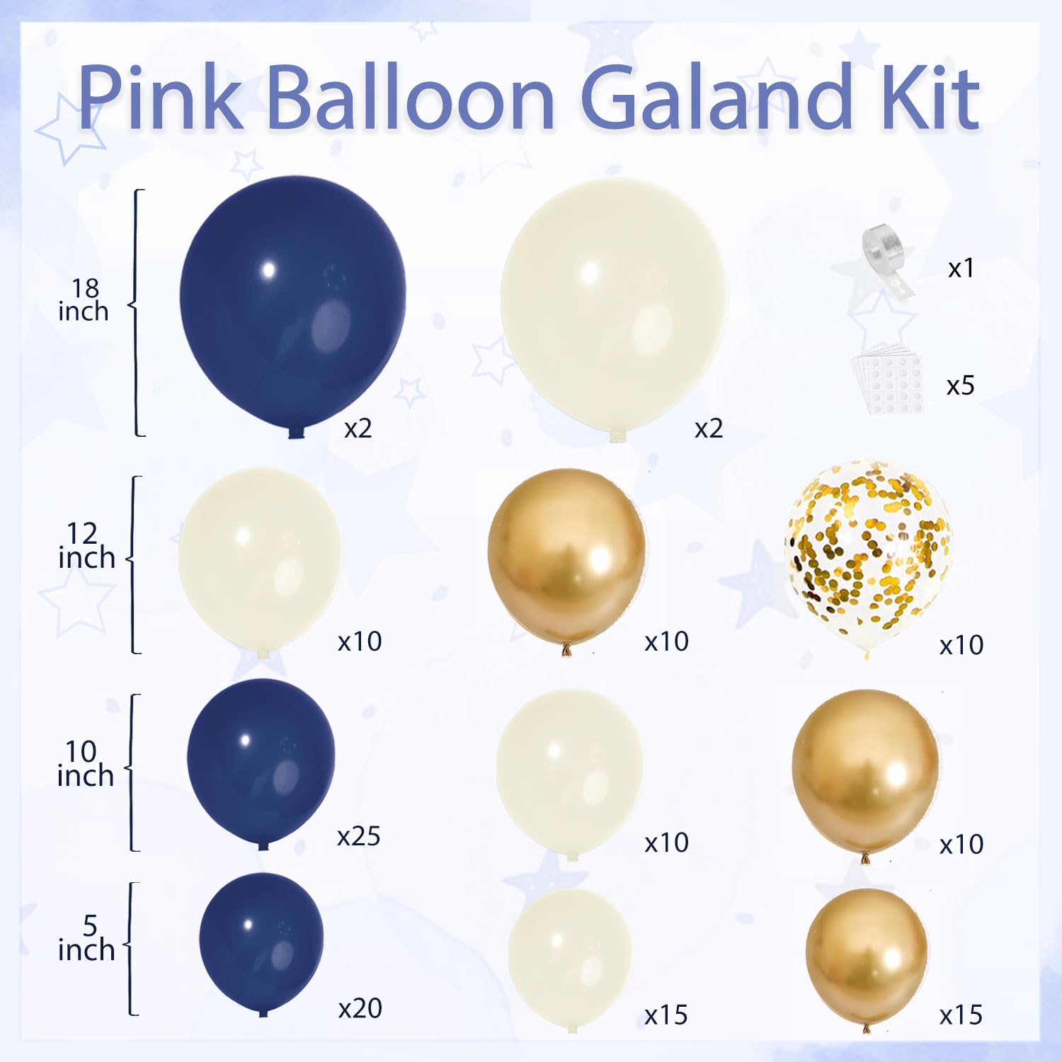 【Blue and Gold Balloons】:This balloon pack includes 129 high-quality balloons in 4 versatile sizes: dark blue Balloons (5" 20pcs +10'' 25pcs+ 18" 2pc), sand white Balloons (5" 15pcs +10'' 10pcs+12" 10pcs + 18" 2pc), Chrome Gold Balloons (5" 15pcs+10'' 10pcs+12" 10pcs ), gold confetti balloons (12" 10pcs ). Features a sophisticated color palette .Perfect for creating a stunning blue and white balloon arch or a luxurious navy blue white and gold confetti balloon garland.