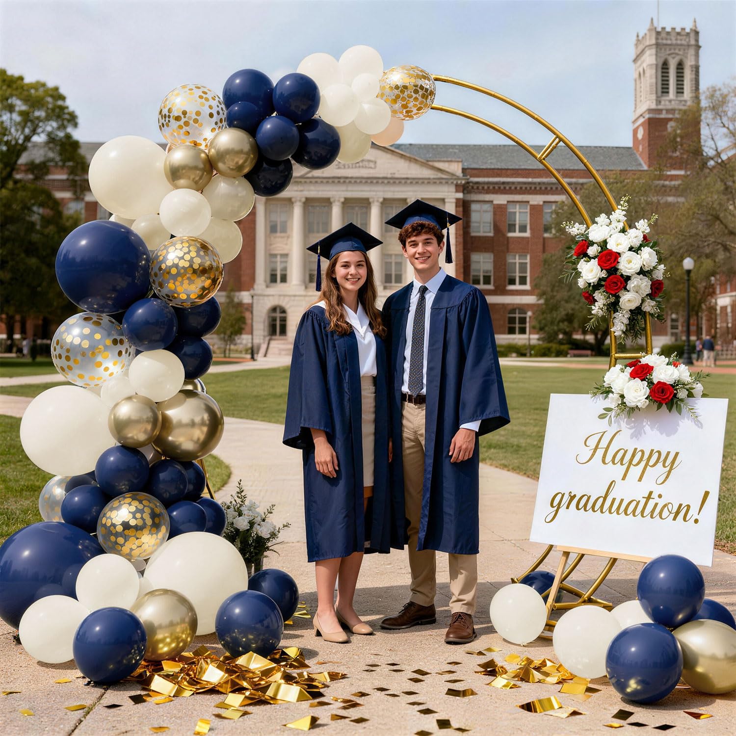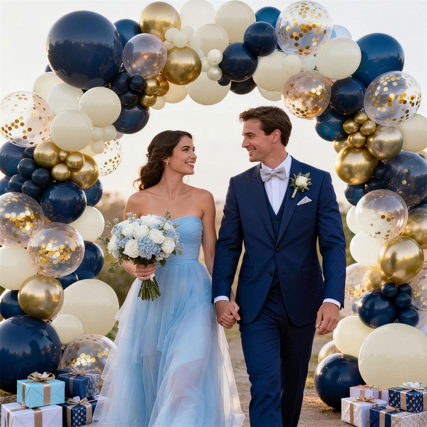Want to create a show-stopping party decor that wows every guest? Our Navy Blue and Gold Balloons Arch Kit is your perfect choice! It's specially designed to help you easily build a professional-looking decoration without any hassle. What's Inside The Box? | All You Need to Know. dark blue Balloons (5" 20pcs +10'' 25pcs+ 18" 2pc) sand white Balloons (5" 15pcs +10'' 10pcs+12" 10pcs + 18" 2pc) Chrome Gold Balloons (5" 15pcs+10'' 10pcs+12" 10pcs ) Gold Confetti Balloons (12" 10pcs ) 1 roll of strip tape 5 glue stickers 129 Premium Balloons: A perfect mix of rich Navy Blue, soft Sand White, metallic Chrome Gold, and festive Gold Confetti Balloons. Essential Accessories: 1 x Flexible Plastic Arch Strip, 5 x Strong Adhesive Glue Dots. Key Features & Benefits | Product Highlights Effortless Assembly: Follow the simple instructions, and you and your friends can assemble a stunning blue balloon arch or garland in no time. Versatile Designs: Besides the classic arch, you can also use this kit to create backdrops, table decorations, and more, unlocking a variety of party looks. Perfect For Your Next Celebration | Suitable for These Wonderful Moments.Whether it's a romantic wedding, a fun birthday party, or a grand graduation, this sophisticated yet festive decorating set will make your event truly unforgettable. Important Tips to Ensure a Perfect Experience Hand-inflation may take 30-60 minutes, so please allow ample time or invite a friend to help you make the preparation part of the fun. Keep the finished product away from sharp objects and high heat sources to extend its display time. In order to keep perfect shape of the balloons shape, please don’ overfill it