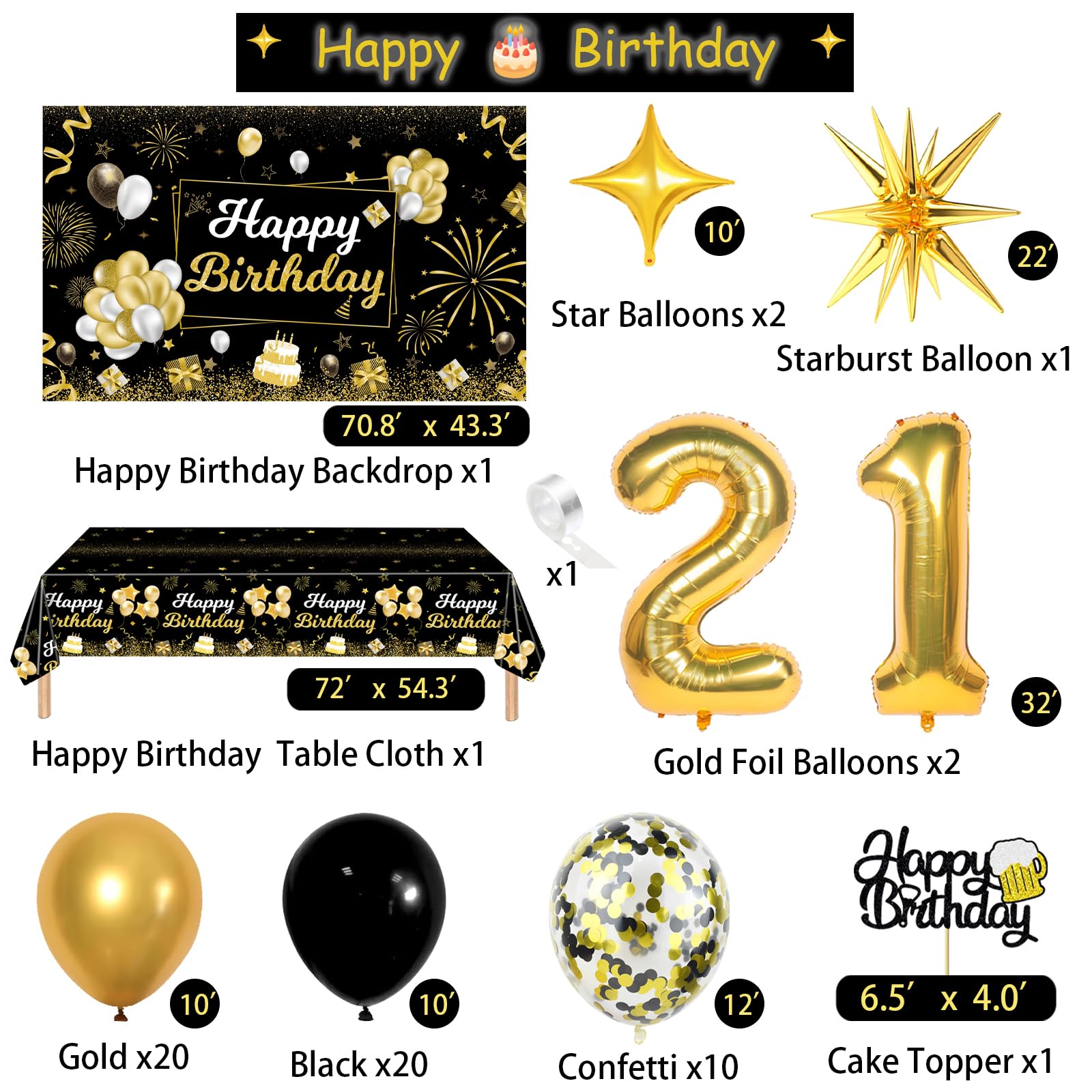 What You Will Receive: 21st Birthday Decorations include 70.8x43.3in ‘happy birthday’ backdrop *1pcs, 72x54.3in tablecloth *1pcs, 32in number *2pcs, 6.5in cake topper *1pcs, 22in explosion star balloon *1pcs, 10in star balloon *2pcs, 10in metallic gold balloons *20pcs, 10in black balloons *20pcs, 12in black and gold confetti balloons *10pcs, balloon tool *1pcs.