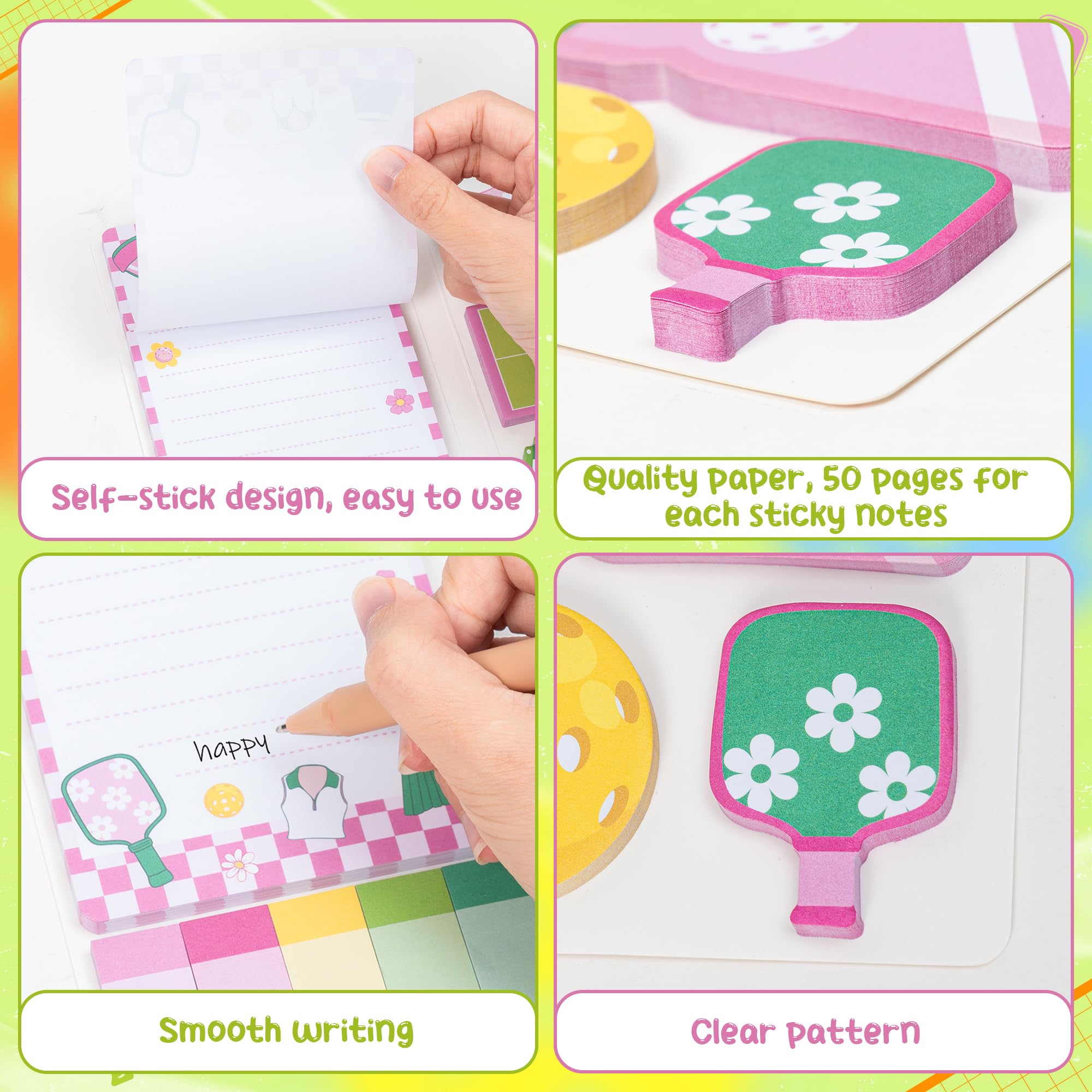 Material: The pink pickleball self-stick notepads are made of paper with soft surface, easy to write, long-lasting color, good stickiness. They can be used multiple times and without leaving glue when you remove them