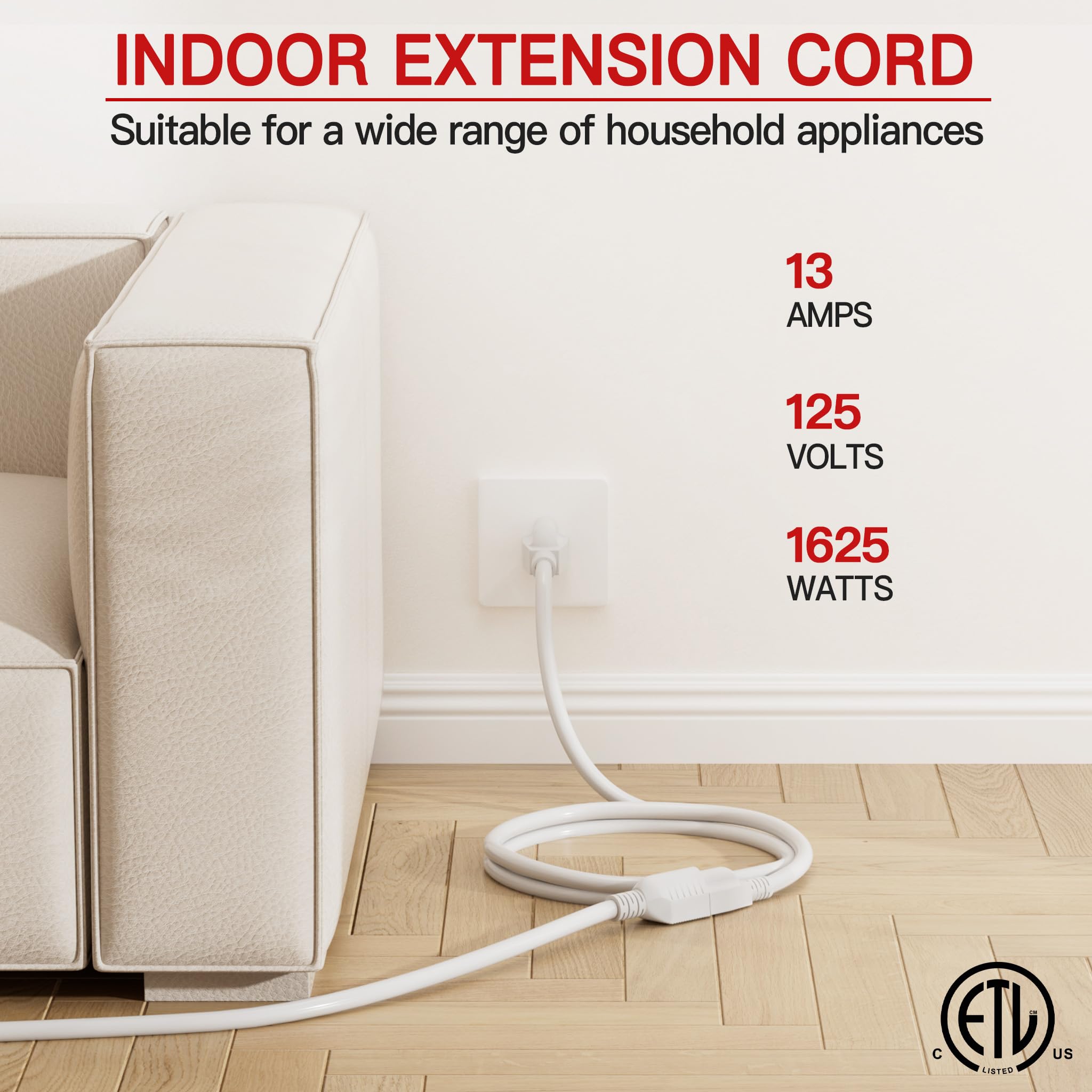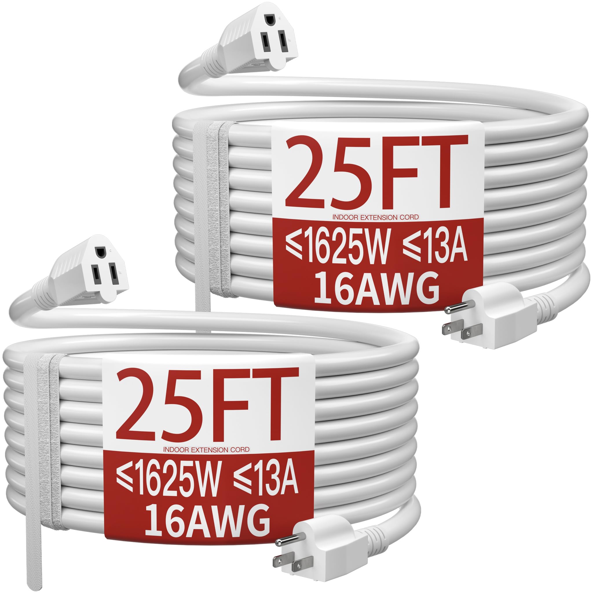 ETL Listed and Trusted: 25 ft extension cord 2pack rated 13 Amps, 1625 Watts and 125 VAC; male NEMA 5-15P and female NEMA 5-15R; it is ETL/cETL Listed; ensuring its compliance with strict safety standards; each white extension cord 25ft 2pack passes a 1500V high voltage test before leaving the factory to ensure safety; reliability and efficiency indoor extension cord are capable of meeting most electrical needs