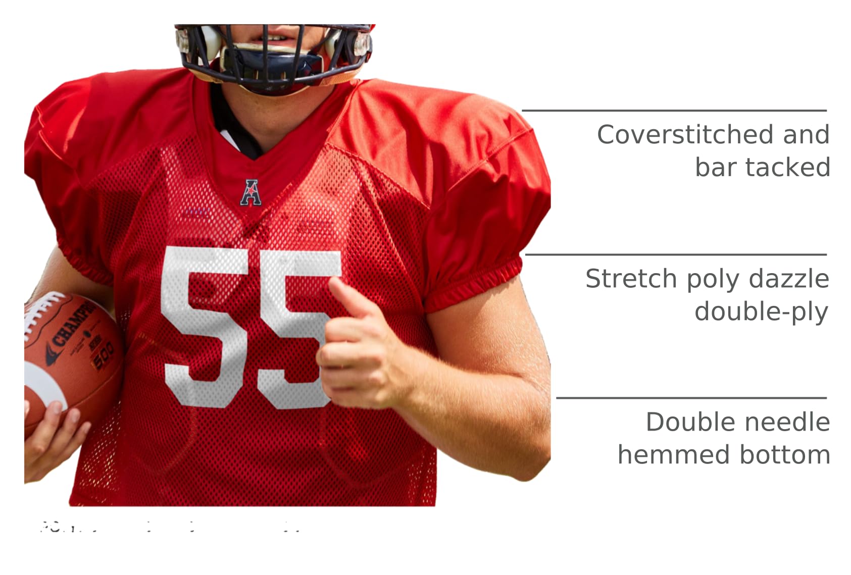 CHAMPRO Time Out Polyester Practice Football Jersey. STRETCH POLY DAZZLE double-ply cowl, sleeves and v-neck. STRETCH POLYESTER PORTHOLE body. Mitered v-neck collar with space for decoration. Finished elastic sleeve, double needle hemmed bottom. Coverstitched & bar tacked for optimum durability.