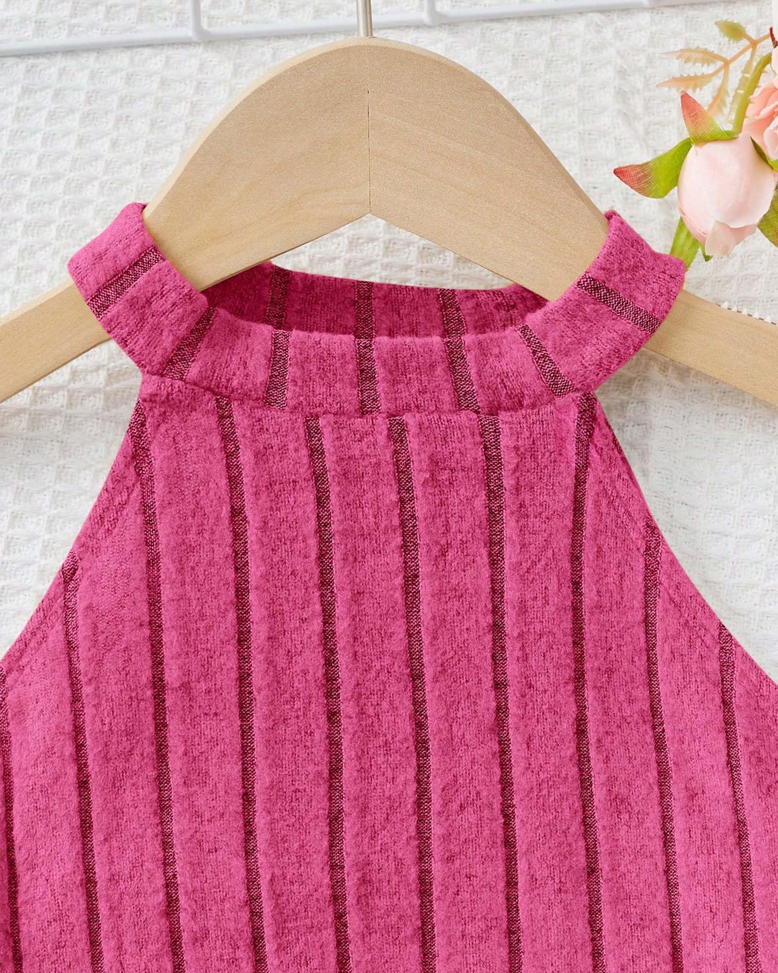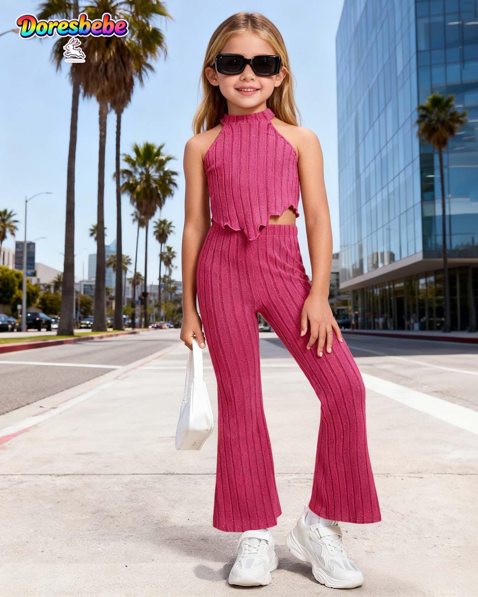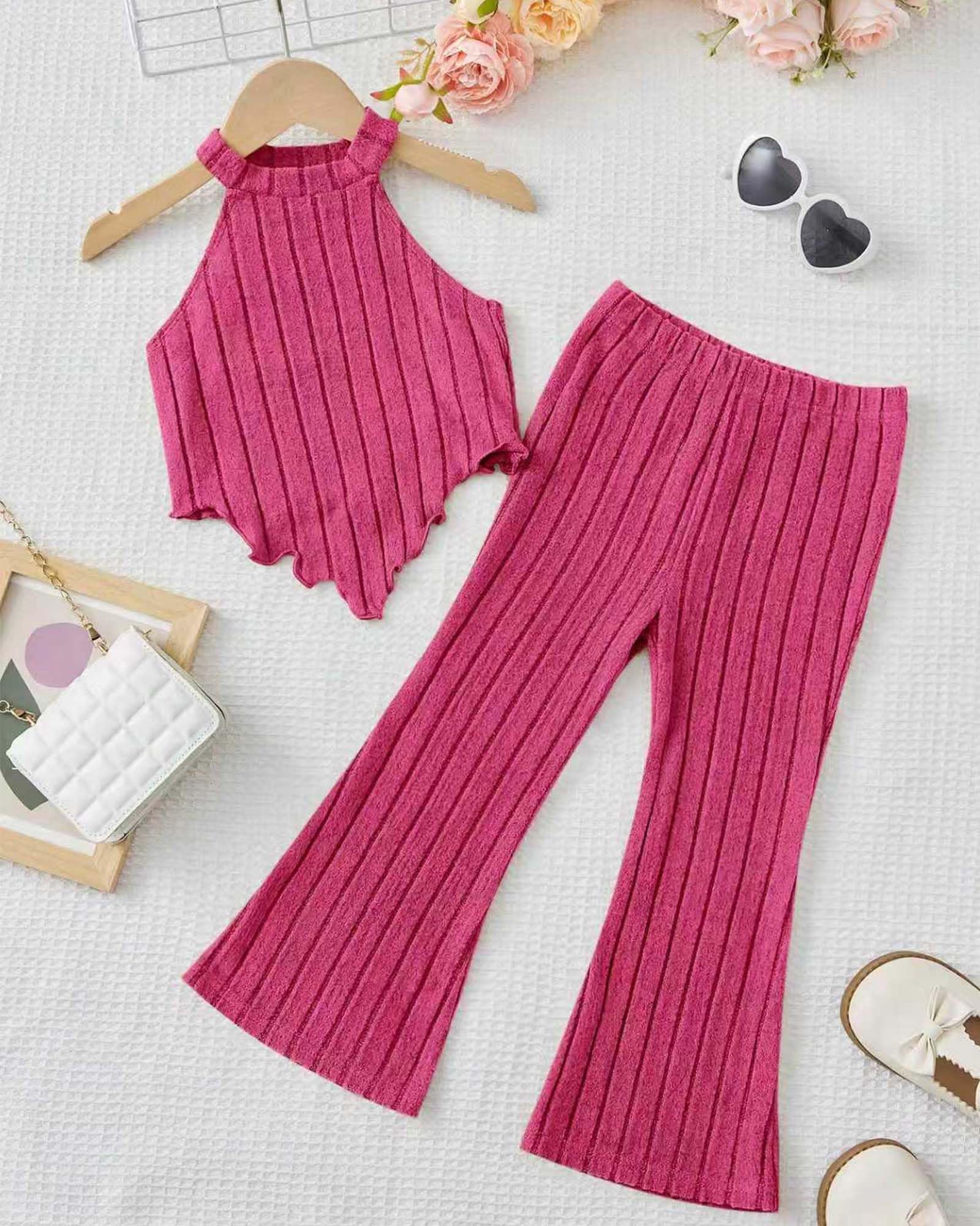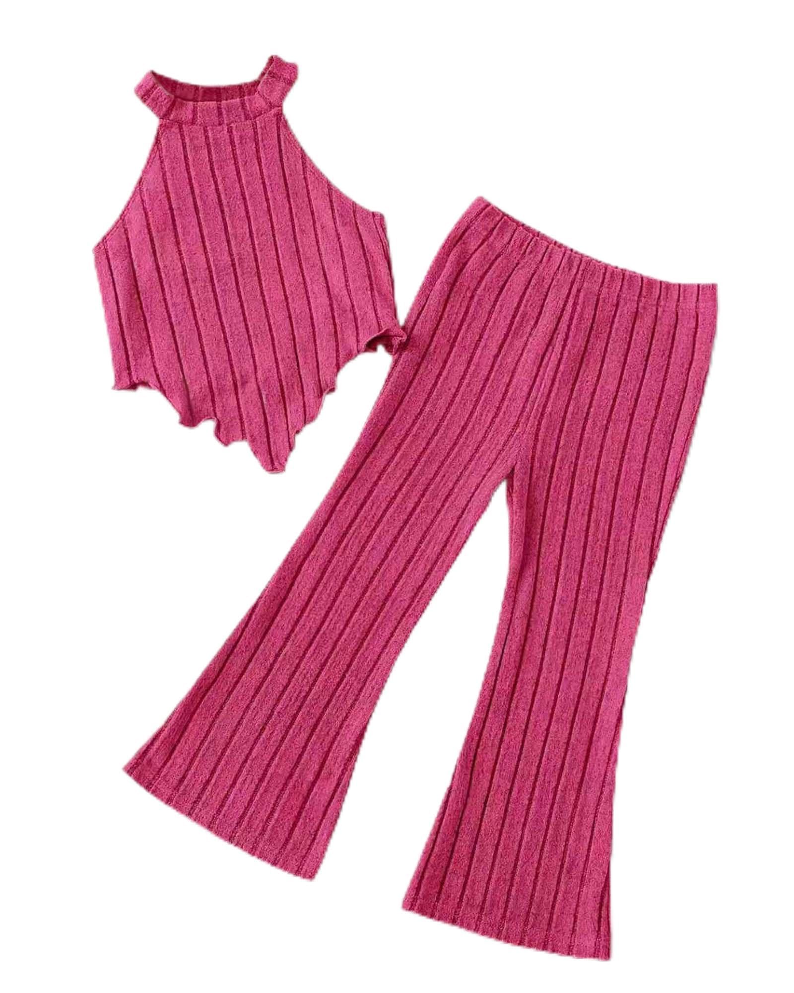 Stylish Two-Piece Outfit with Trendy Flare Design:This fashionable girls’ outfit features a sleeveless round-neck crop top matching legging or flared-leg pants. The elegant silhouette gives a chic, modern look that’s perfect for casual wear, playdates, or special occasions.