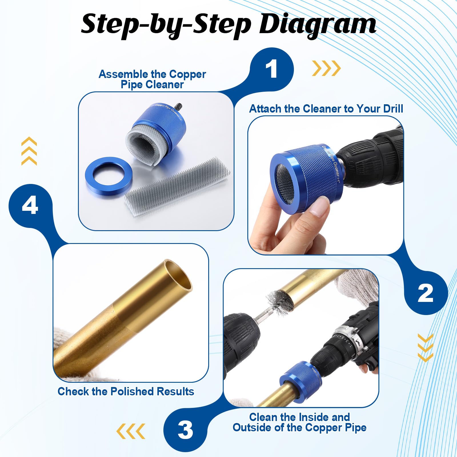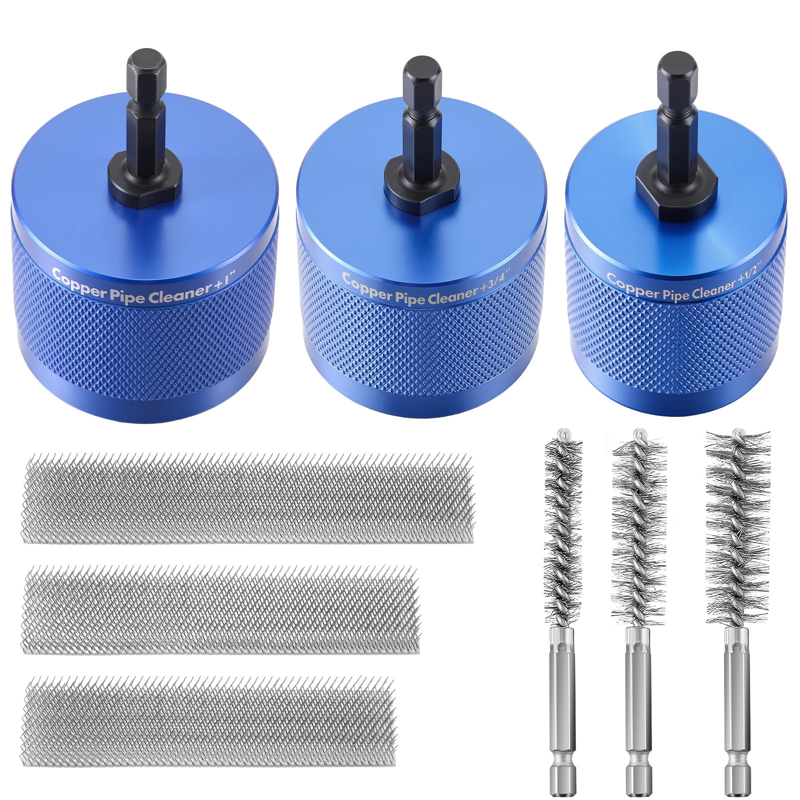 Package Includes: You will receive 1 set of Copper Pipe Cleaner for Drill (sizes: 1/2", 3/4", 1") with durable aluminum alloy housing, plus 1 set of built in Replacement Steel Brushes. Also included is a set of Inner Pipe Cleaning Brushes (sizes: 1/2", 3/4", 1") made of stainless steel