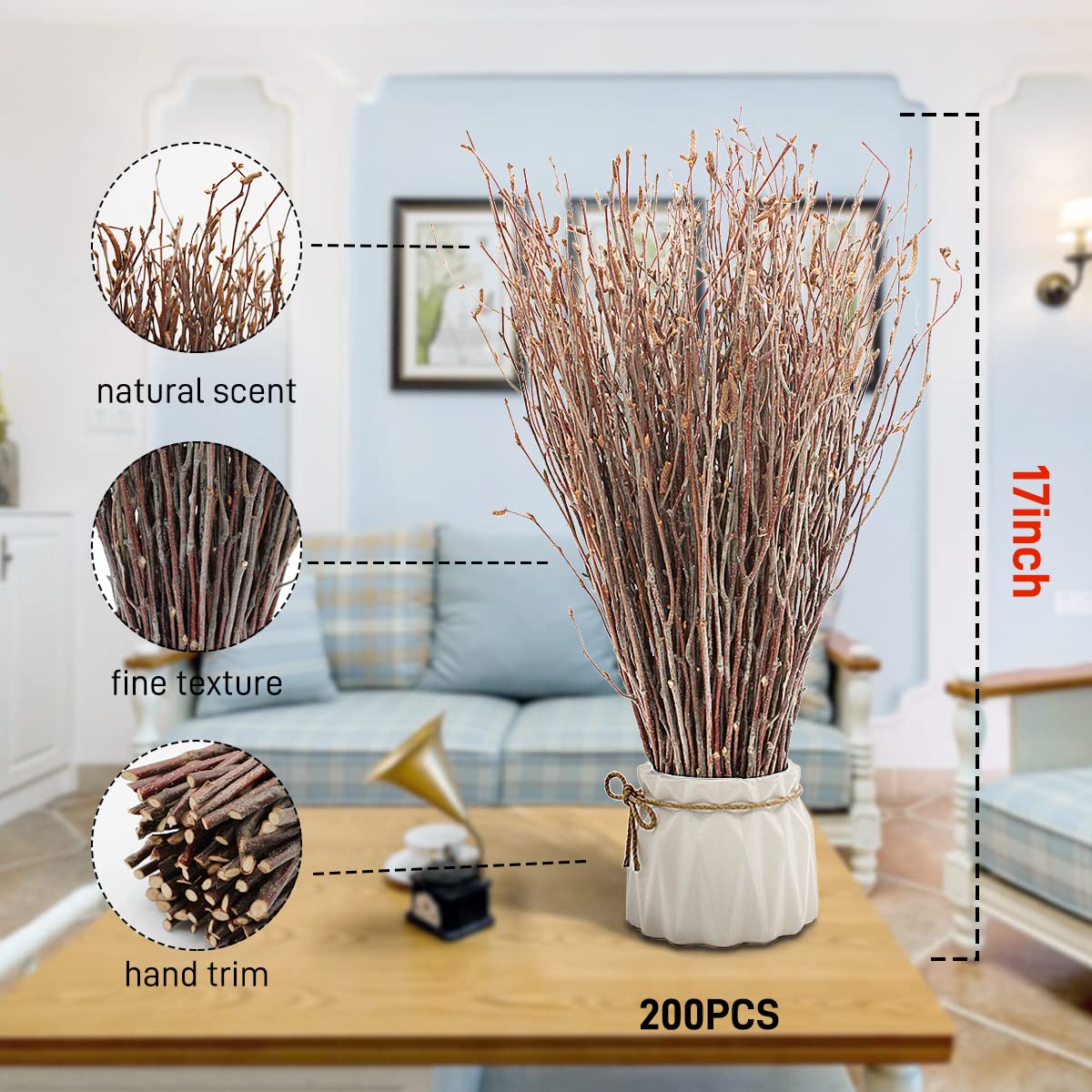 【Great Value】This package includes 4 bunches of birch twigs bulk, 50 in each bunch, total 200Pcs. These decorative branches measure approximately 16-17 inches long, and each twig is strictly handpicked and cut to ensure uniformity in size and quantity.