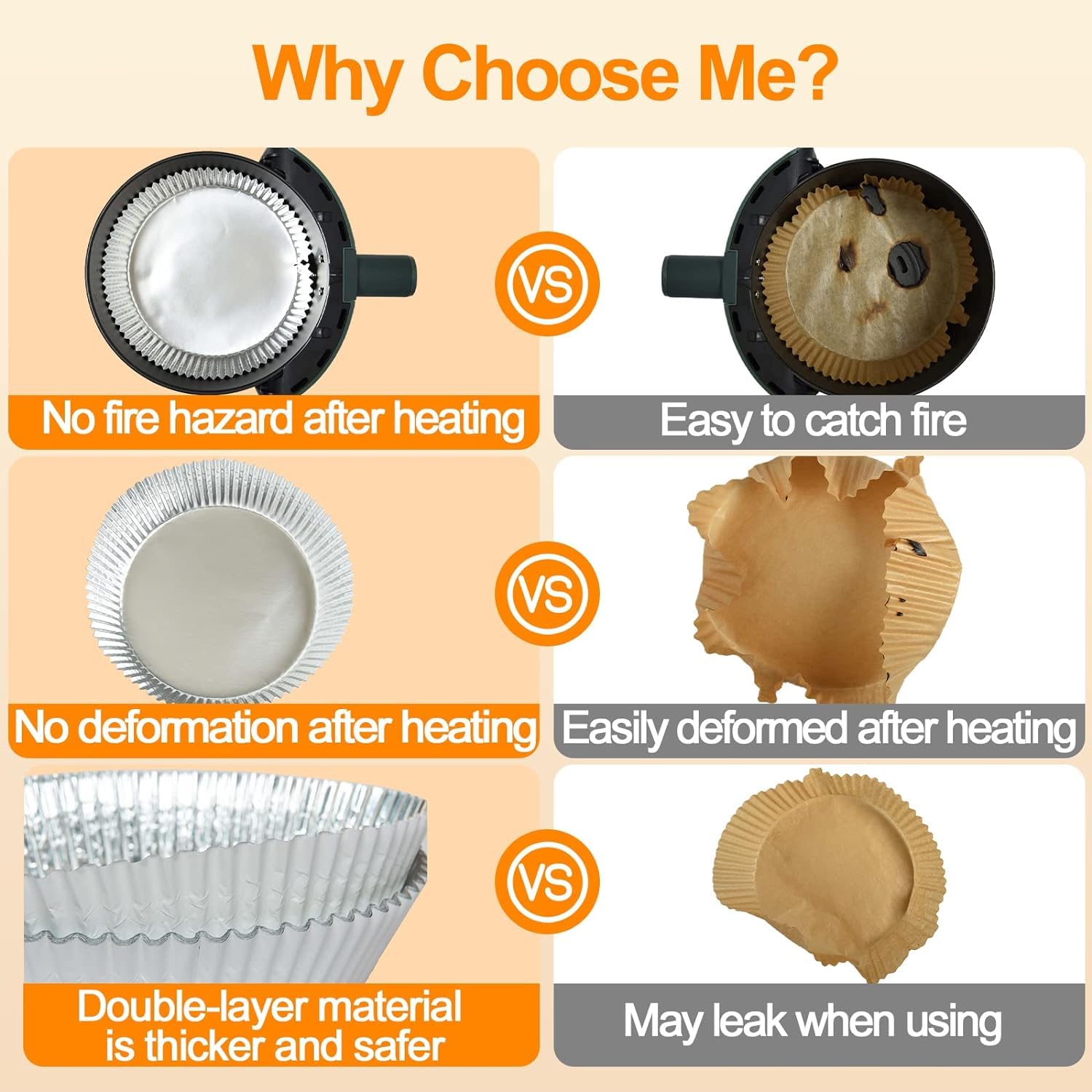 【Food Grade Material】:Our Air Fryer Liner is made of two layers of material. The inside is food grade aluminum foil and the outside is parchment paper. The double-layer material is thicker and safer.Totally Chlorine Free and totally food safe.