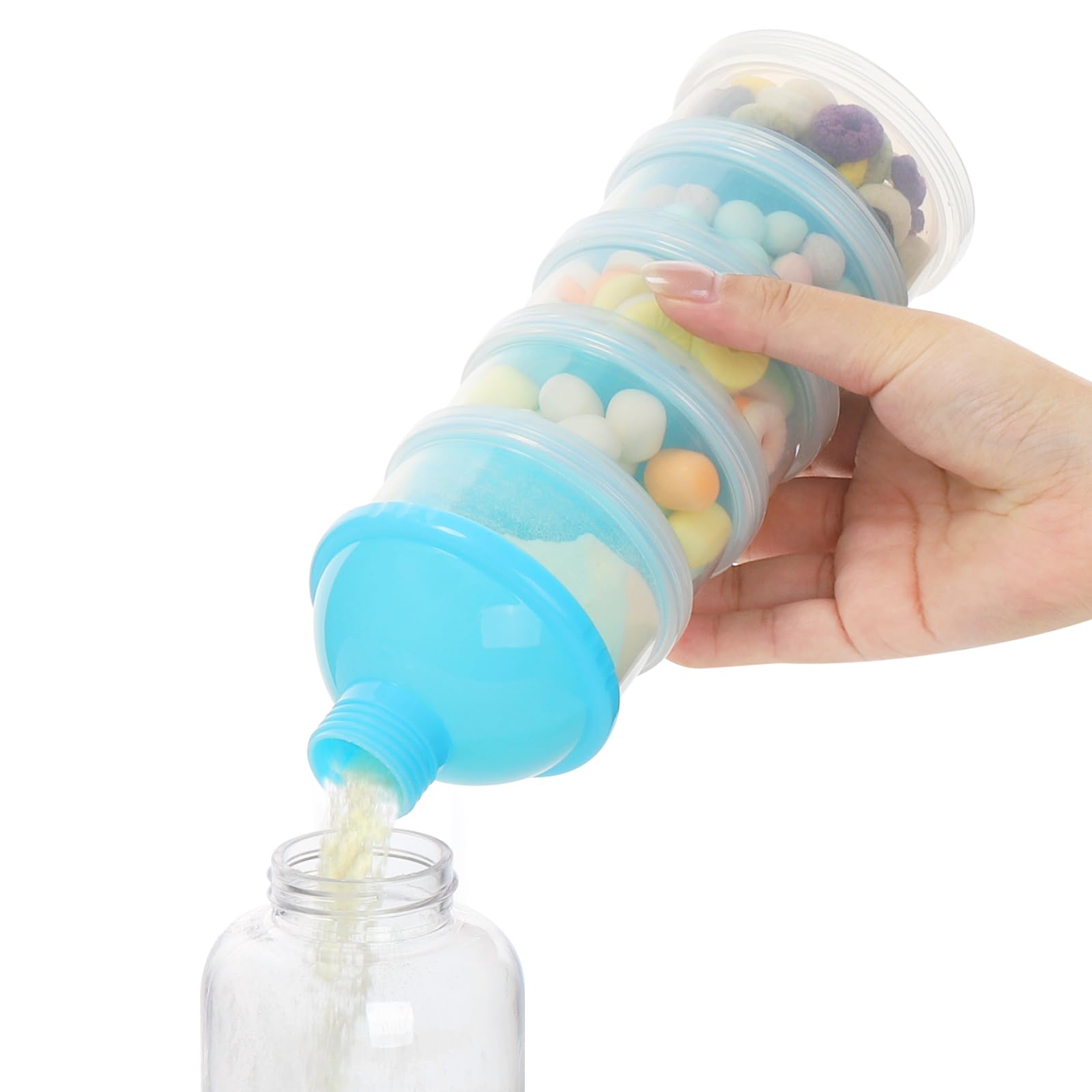 Capacity - 5 layers design. You can put quantity of baby formula on each layer. A total of 5 layers of pre measured milk powder or food can be placed. Very pratical formula container for on the go.