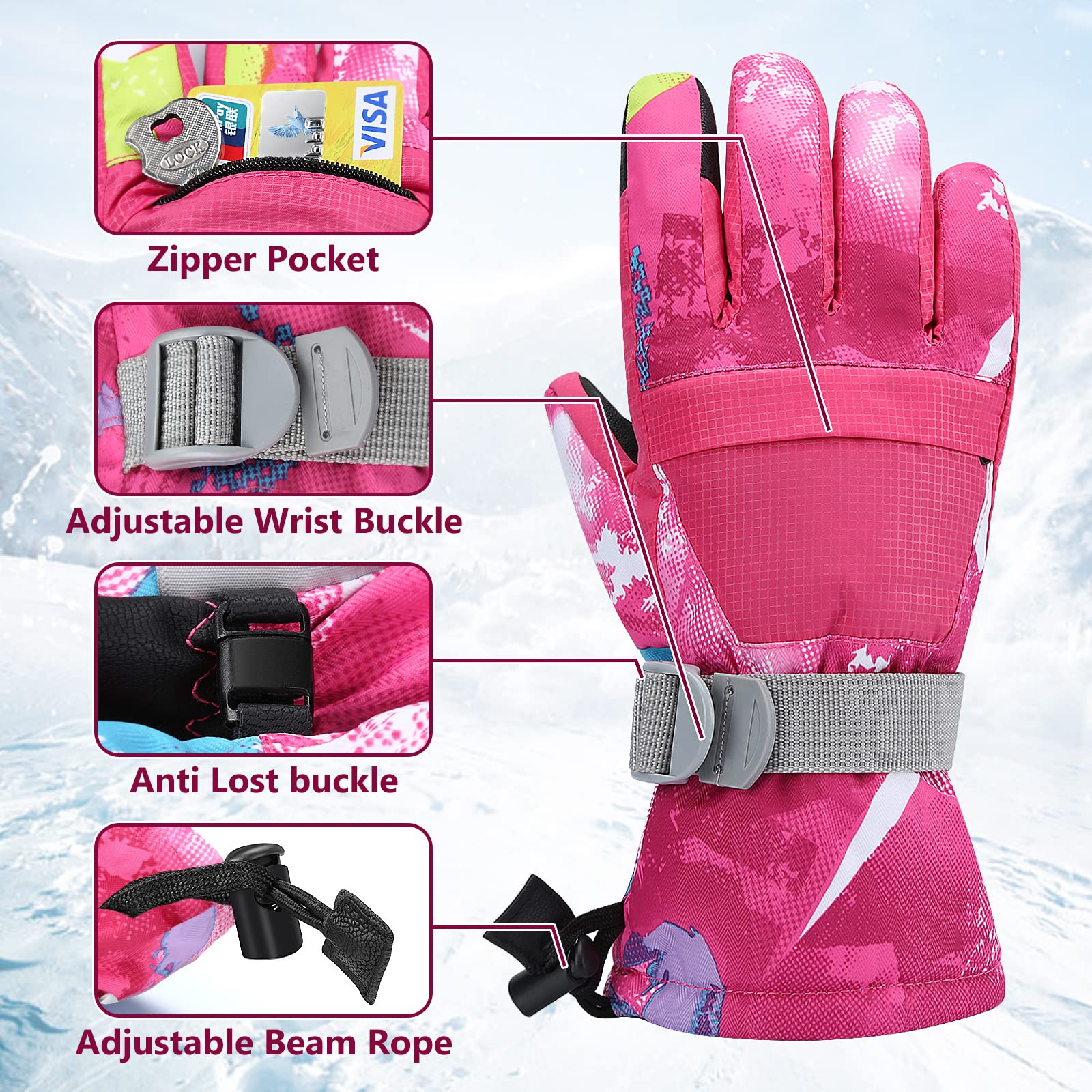【Waterproof Ski Gloves】: The insert waterproof PU fabric can prevent snow water permeating into skiing gloves. You will enjoy with it for any outdoor sports like snowing or rainning.Windproof Kids Gloves: The gloves make of composite five-Layer fabric prevents cold wind and snows outside.