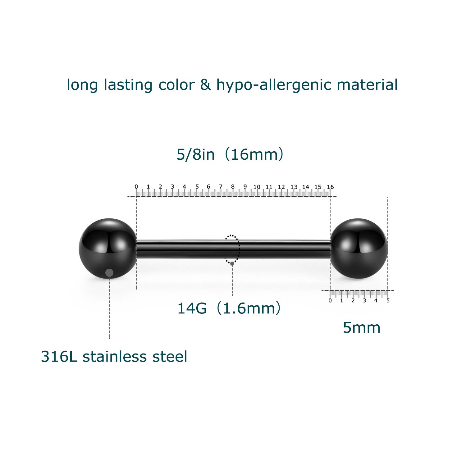 Size: 14G gauge (1.6mm), Bar length: 16mm (5/8 inch), Ball diameter: 5mm