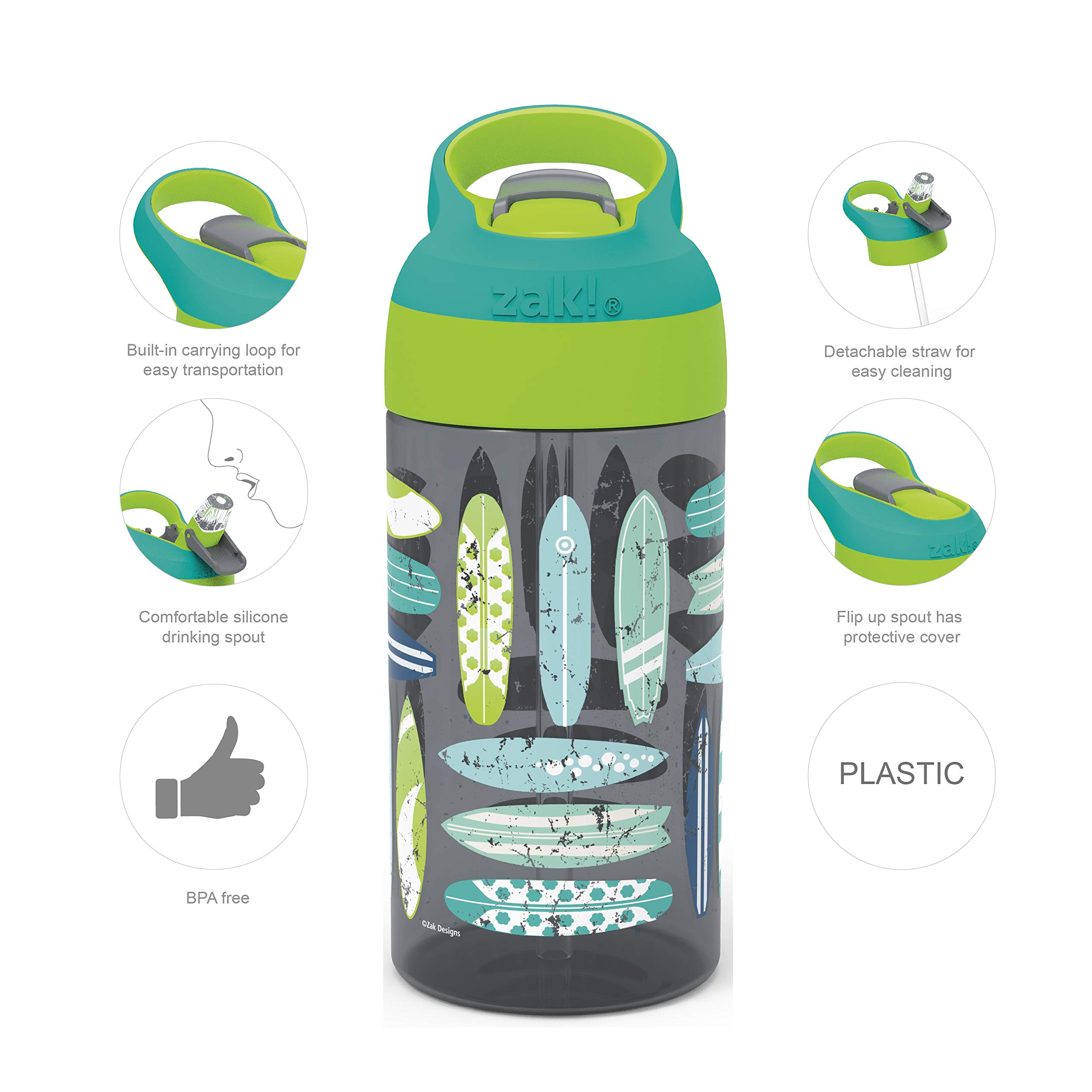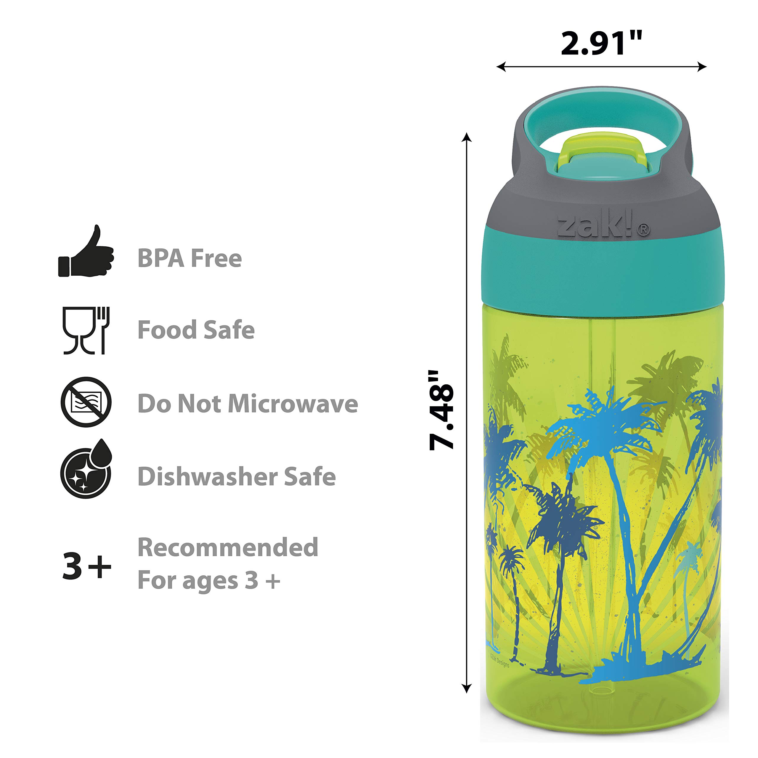 Let kids enjoy hydration with fun water bottles by Zak Designs! Reusable and Durable Material: Reusable water bottles will last wash after wash; good for you and good for the environment! The drinking bottle is made of plastic, which is BPA free, dishwasher safe, and durable enough for kids to use every day. Leak-Proof Lid: The lid screws on securely and won't leak when the spout is closed. A button release to flip up the spout keeps drinks easy to access. On the Go: The water bottle has a built-in carrying loop on the lid for easy transportation and fits in most car cup holders, with a cover to help keep the spout clean. Specifications: Set includes 2 water bottles with different designs. 16 oz capacity. Made of durable plastic. BPA free - Zak is committed to safety. Dishwasher safe, do not microwave. Length: 3.88-inch, Width: 2.83-inch, Height: 7.27-inch. Design: Surf Boards and Palm Trees.