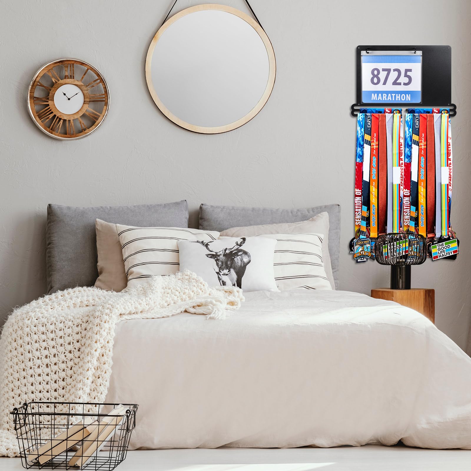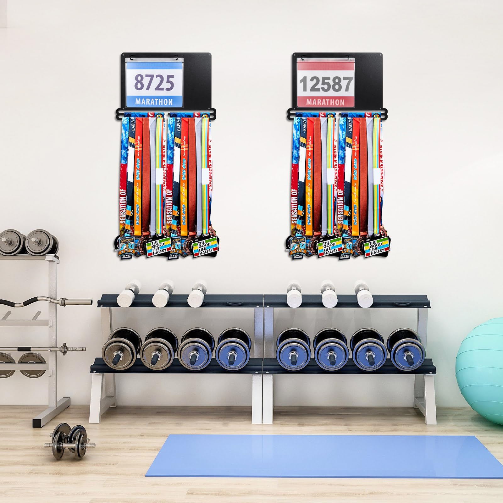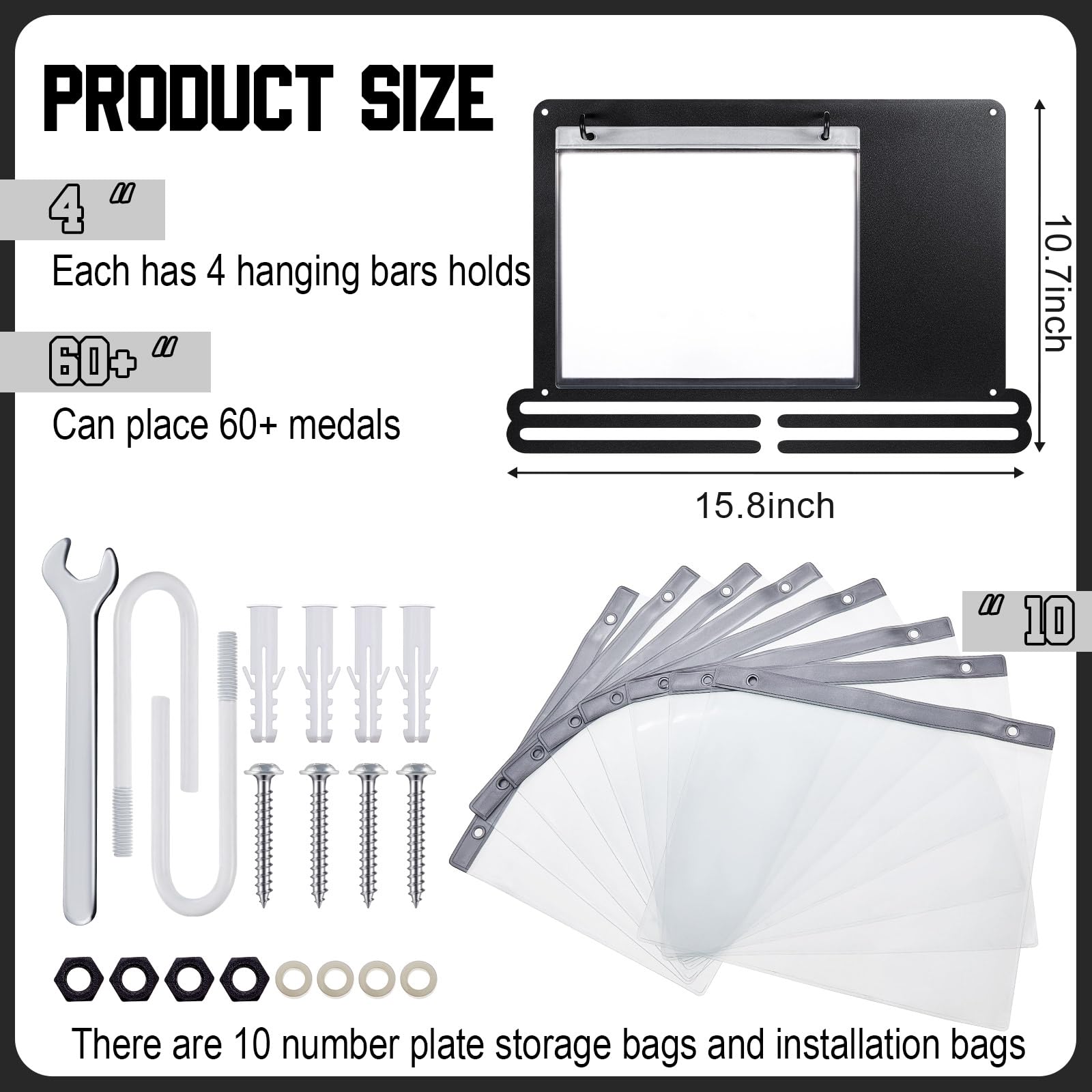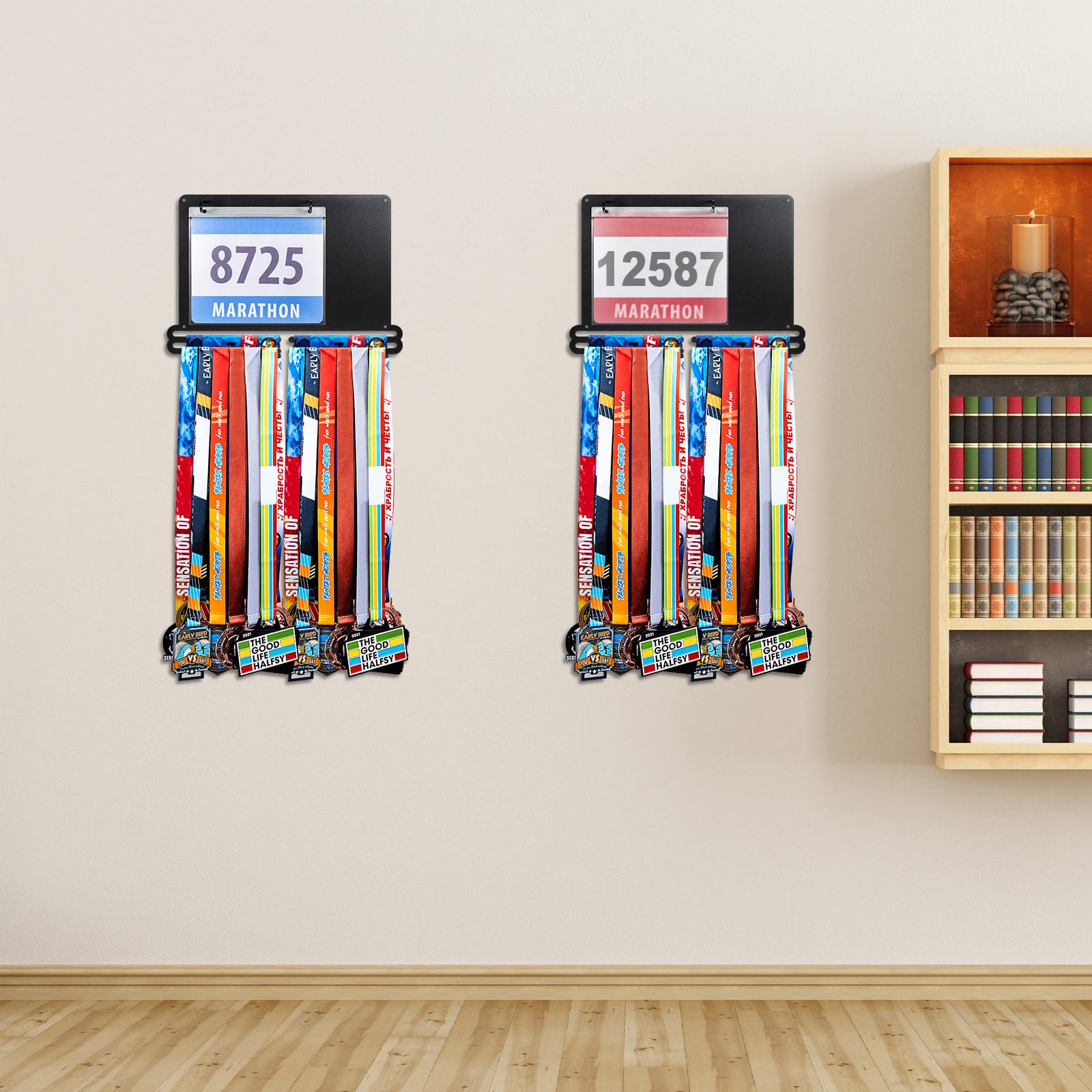 Convenient to install: the race medal display rack is designed for wall mounting to maximize space and keep your medals and bibs organized, the package comes with the appropriate mounting kit, you simply attach the rack and screws to the wall, then place the medals in the plastic bibs and hang them on the hooks, slide your medals onto the bars