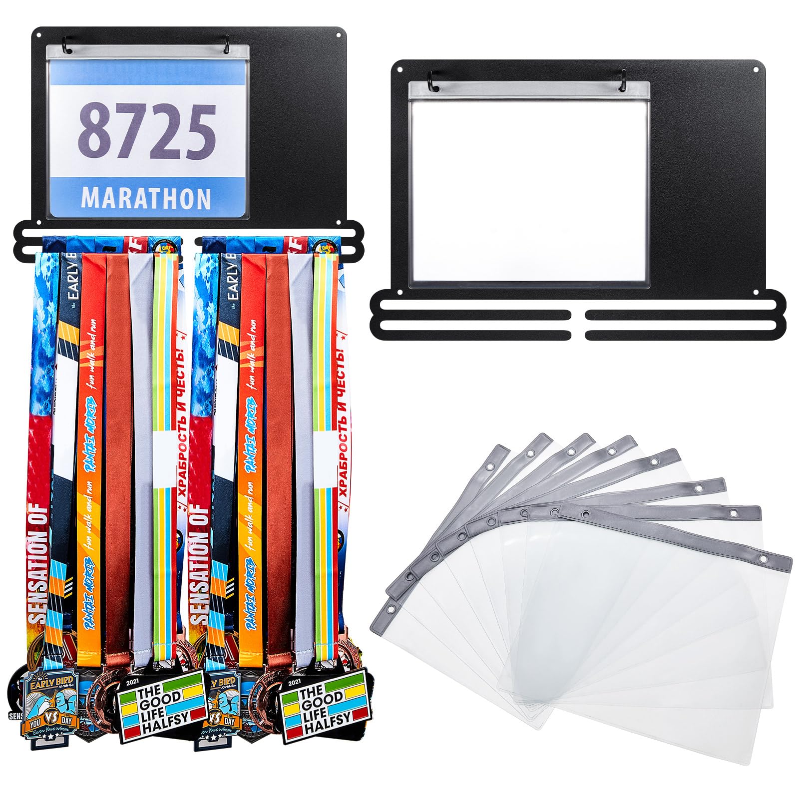 Package Content: the package comes with 1 piece of race medal and bib display with 10 pieces race bib holder pouches, and the size is approx. 15.8 x 10.7 inches, at least 20 number plates and 60 medals can be stored, enough quantity and practical design to meet your various needs for medal storage