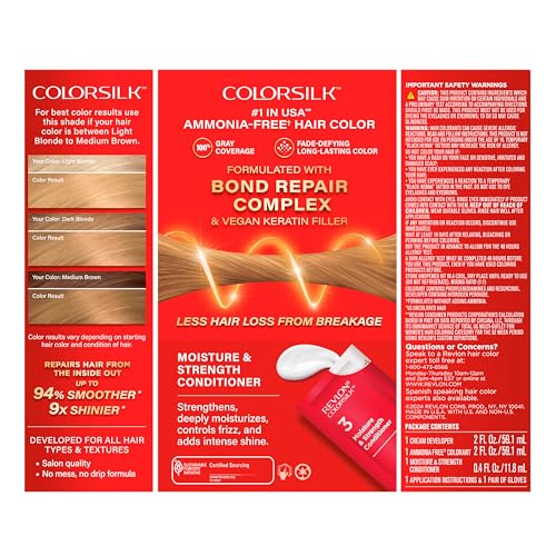 Revlon ColorSilk with Bond Repair Complex + Vegan Keratin Fillers does more than color your hairβit helps repair it from the inside out, for hair that looks and feels stronger and healthier. Up to 98% less breakage* and up to 94% silkier* 9X shinier hair.* The salon-quality formula still delivers everything you love: 100% gray coverage, zero ammonia** and a no-drip gel texture. Expect everything from the #1 hair color in the U.S.*** Works on all hair types and textures. *Vs. uncolored hair **Formulated without adding Ammonia ***Revlon Consumer Products Corporation's calculation based in part on data reported by Circana, LLC, through its OmniMarket Service of Total US Multi-Outlet for Women's Hair Coloring Category for the 52-week period ending March 2nd, 2025 using Revlon's custom definition.