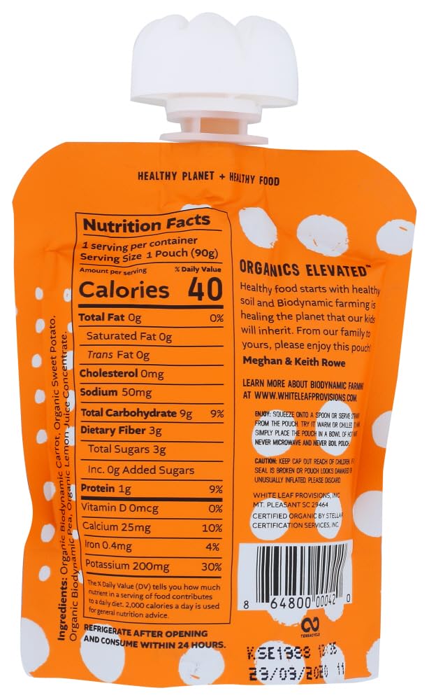 Loaded with Organic Fruits and Vegetables -This unsweetened baby food blend is crafted from nutrient-rich biodynamic and organic ingredients, featuring a mix of carrot, sweet potato & pea