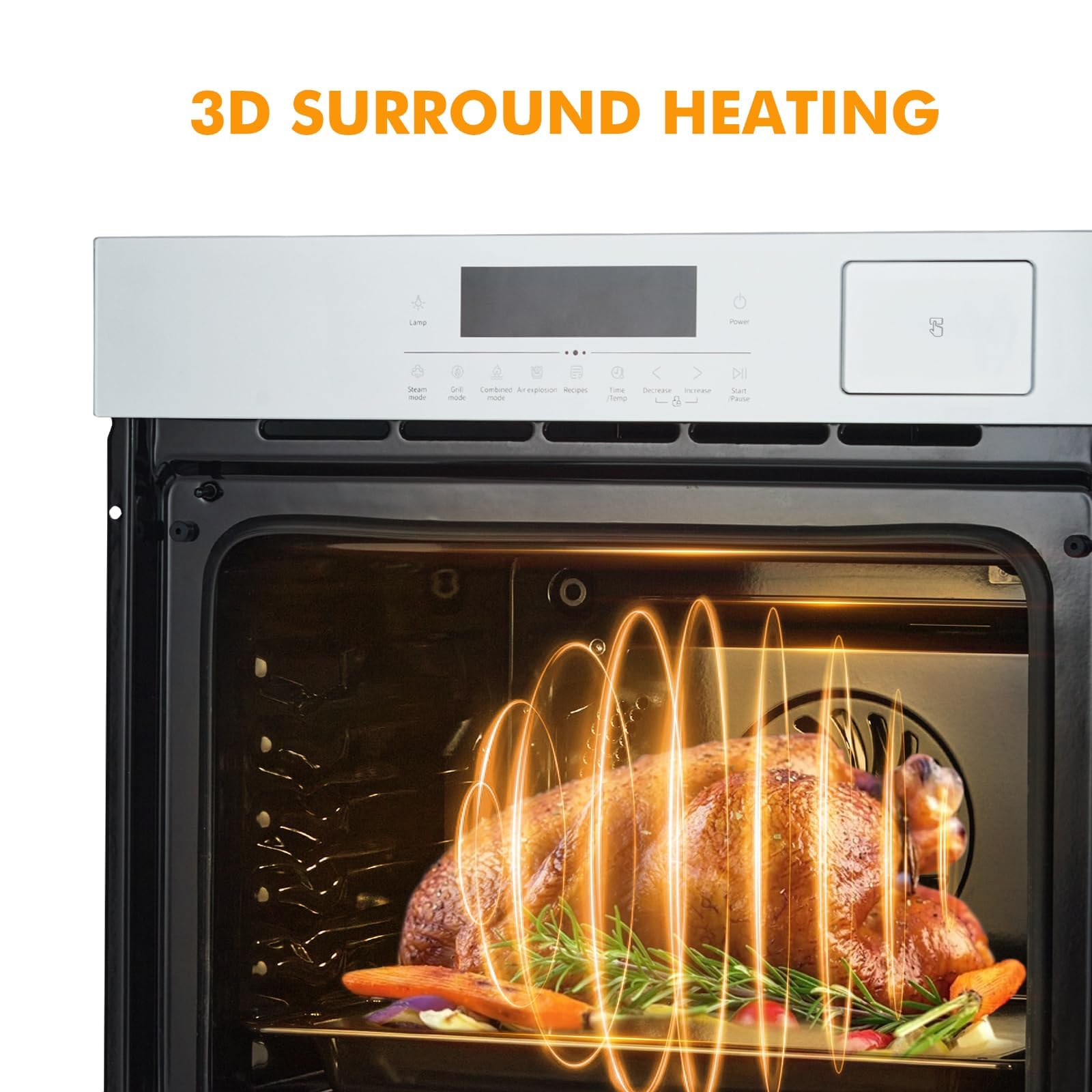 【3D Cyclic Heating】 This 24-inch built-in steam & convection oven combines dual-core functions—steam lock-in moisture + 3D cyclic convection (3000W lower heater + 3500W top heater). It circulates heat & steam evenly across the 2.5 Cu.Ft cavity. For commercial use (small cafes/bakeries) or home cooking, it keeps meats juicy, pastries fluffy, and veggies crisp—no more dry dishes or uneven doneness. Perfect for combo cooking (steam-bake/steam-roast) that balances health and flavor.