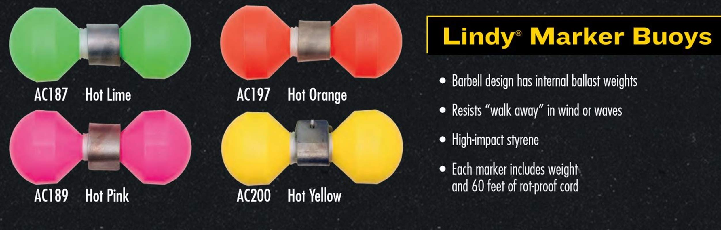 Mark a hot spot and find it again at a glance! The Lindy Tournament Marker Buoy Rack has a barbell design that features internal ballast weights for resistance to walking in wind or current. This high-impact styrene marker includes weight and 60 ft of rot proof cord. The Pack enures quick and easy acces to three hot-colored, high-visibility buoys for creating one's own marking system!