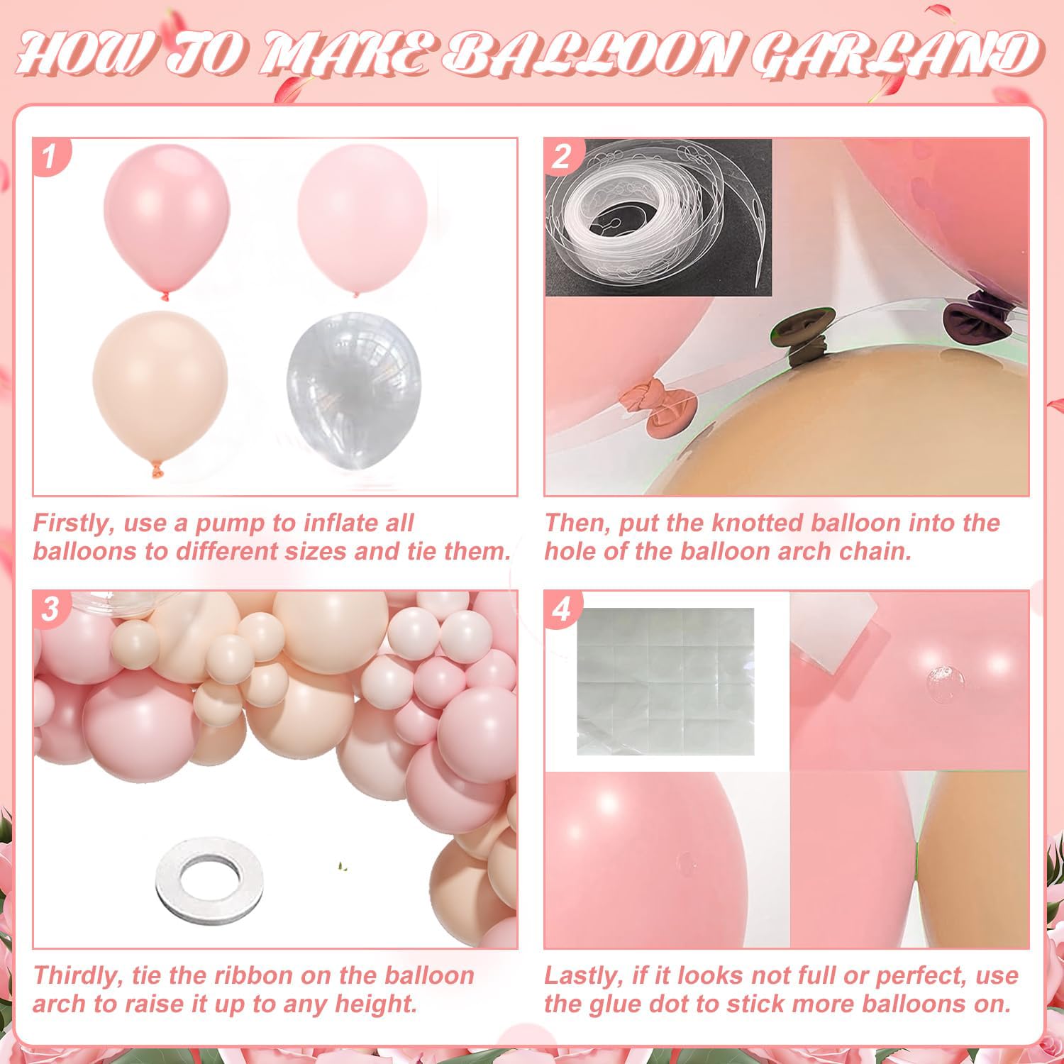 PACKAGE INCLUDES: 126pcs balloon arch garland kit in 4 sweet colors:light pink,macaroon pink, light macaroon orange and clear. Balloon Sizes & Quantities: 6pcs 18" balloons, 60pcs 10" balloons, 60pcs 5" balloons, 1pc balloon chain and glue point. You can put together this light pink balloon garland that makes a wonderful statement piece