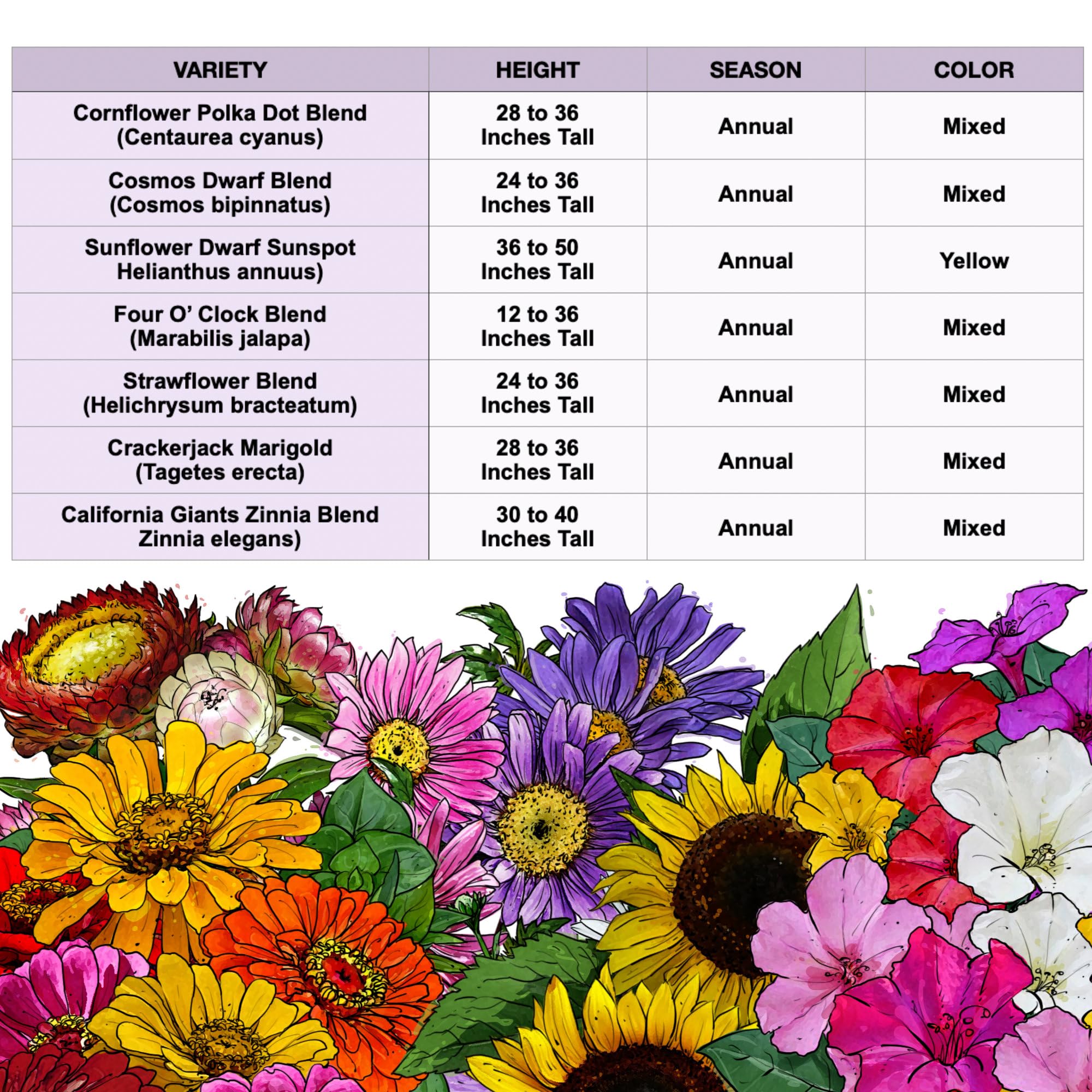 Annual Flower Seeds: Includes varieties such as polka dot cornflower, dwarf cosmos, dwarf sunspot sunflower, four o clock mix, mixed strawflower, crackerjack marigold and California giants zinnia.