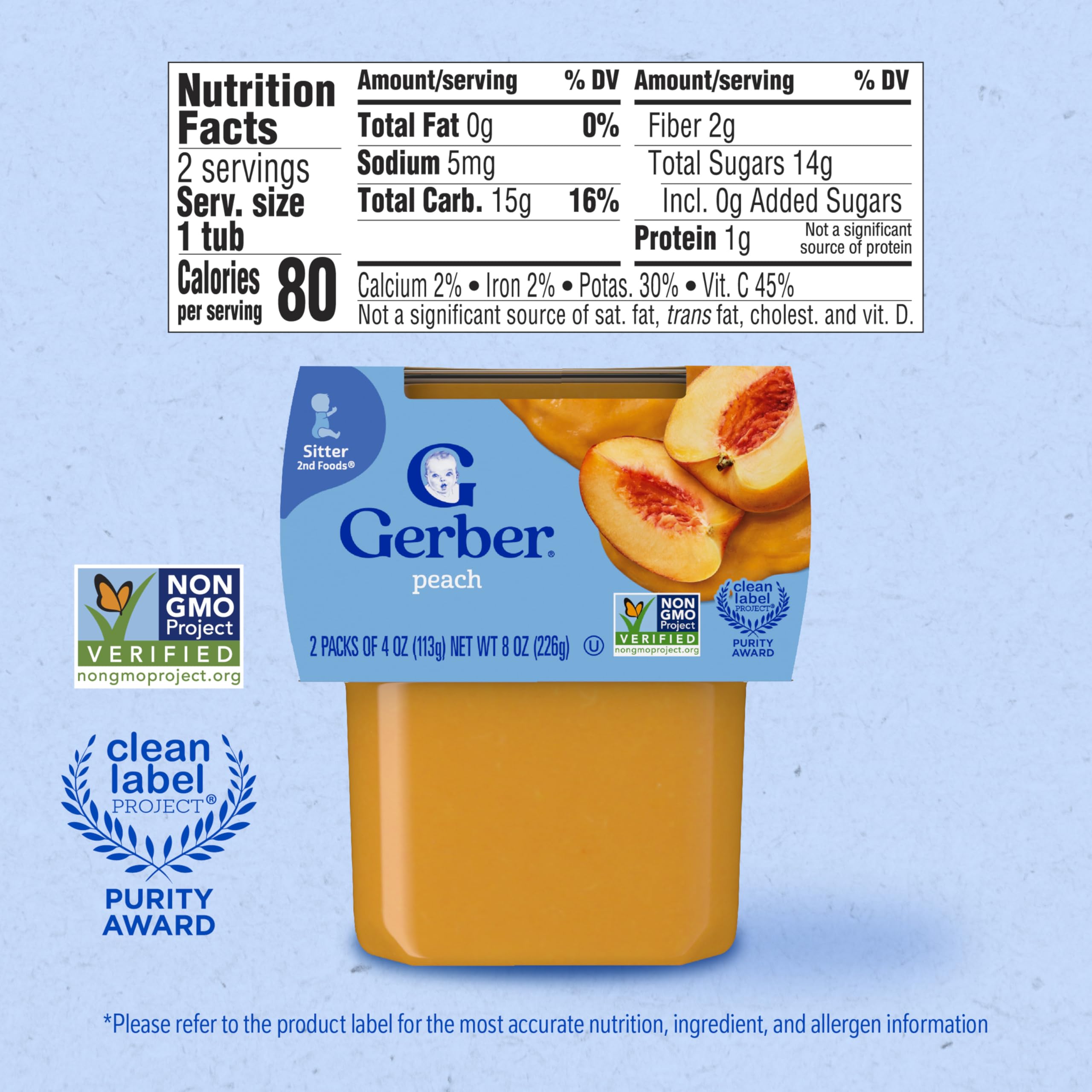 Gerber Stage 2 Baby Food, Peach Puree Tubs are a premium choice for your child’s early stages. Crafted to help support their nutritional needs, along with meeting the busy lifestyle needs of caretakers and parents. Each baby puree tub comes in a portable, easy-to-store format – making it perfect for life’s busy moments. This stage 2 baby food puree is designed for babies who are 6 months + and are ready to explore new textures and flavors. Gerber understands the importance of providing wholesome ingredients during the crucial developmental stages of your child's life -- that’s why our baby puree is Non-GMO Project Verified. Gerber baby puree is ideal for parents who seek a convenient and high-quality option in their baby's diet. These tubs need to be refrigerated after opening and must be used after 1 day.