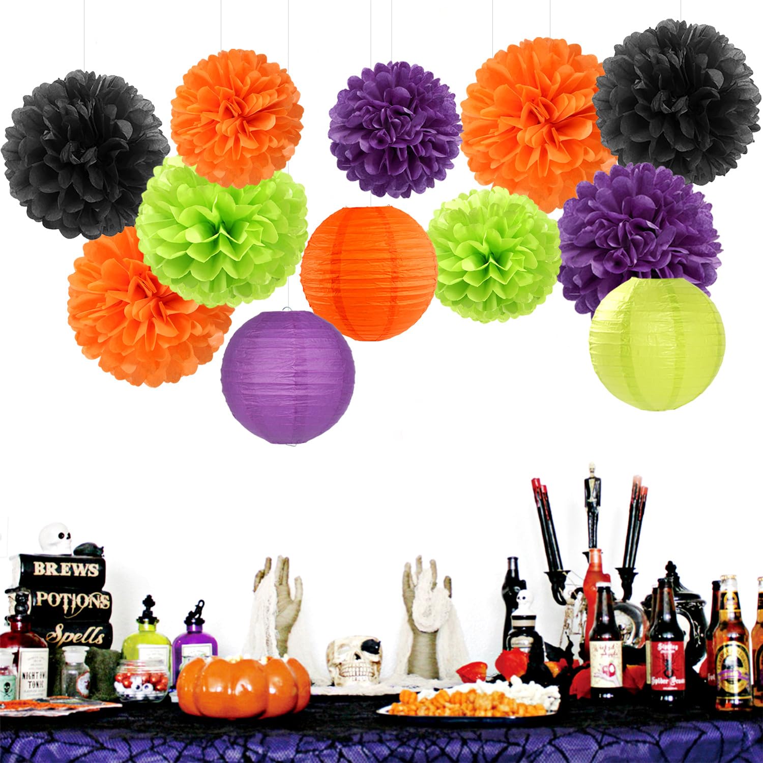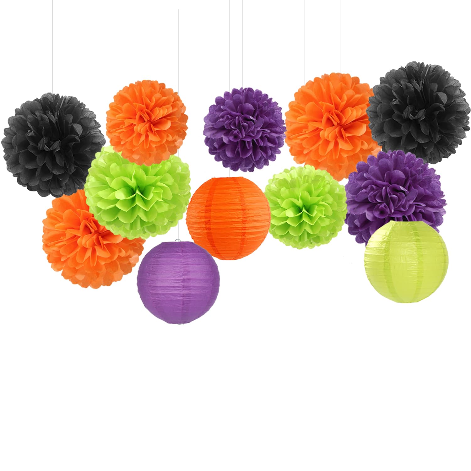 【Black Orange Purple Green Party Decorations Kit Includes】The party decorations kits include 9pcs tissue paper flowers: 6pcs 10" and 3pcs 8" in black orange purple green color, 6pcs 8inch paper lanterns.