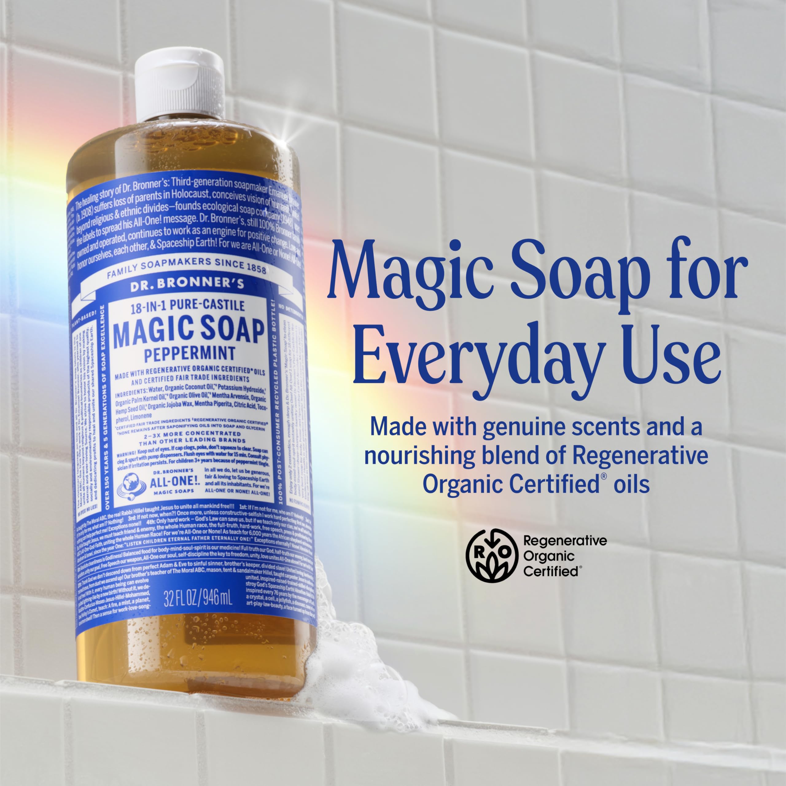 MADE WITH ORGANIC OILS & CERTIFIED FAIR TRADE INGREDIENTS: Dr. Bronner's Pure-Castile Magic Soap are made with over 70% certified organic & fair trade ingredients—an ethical, sustainable choice and a gentle peppermint soap liquid for all!