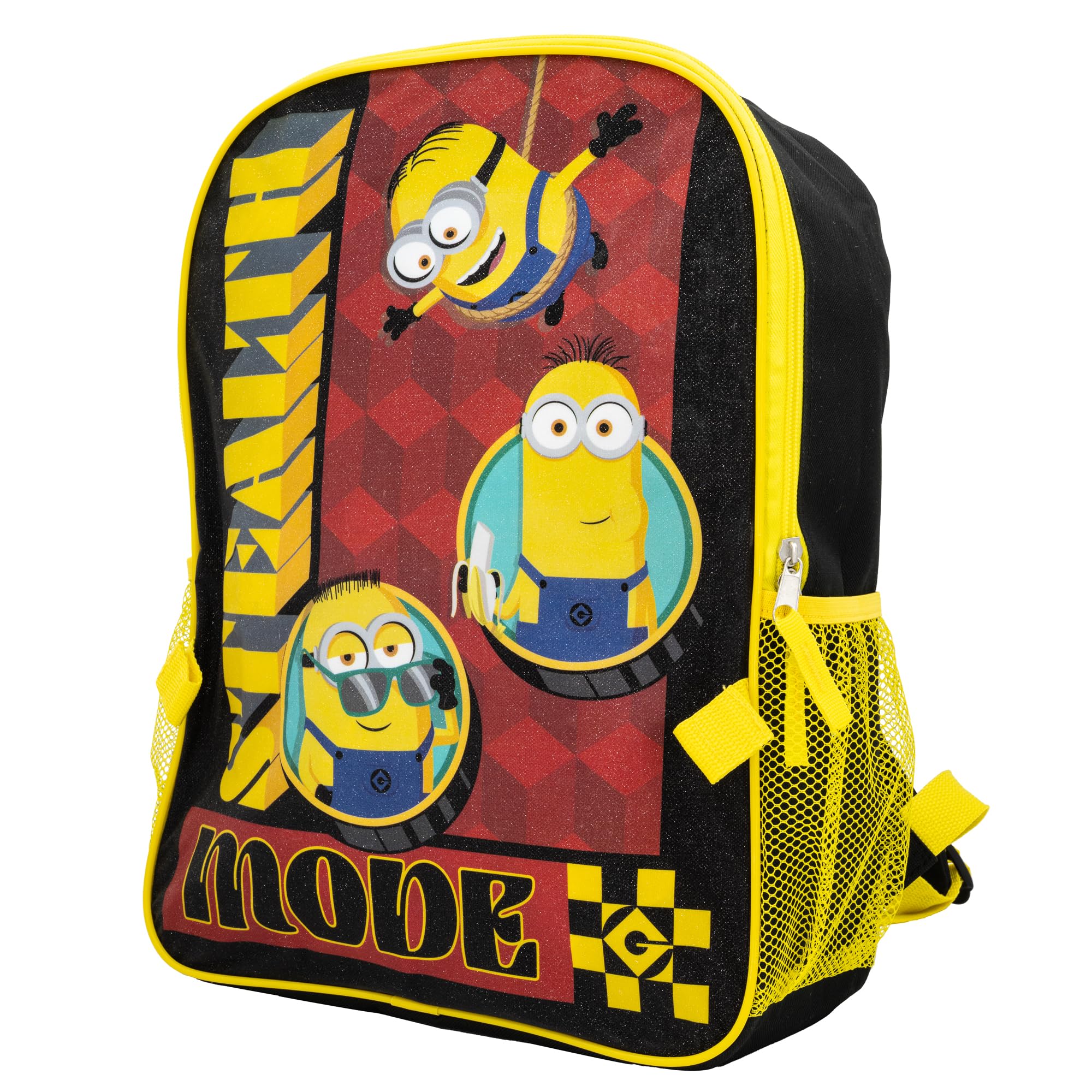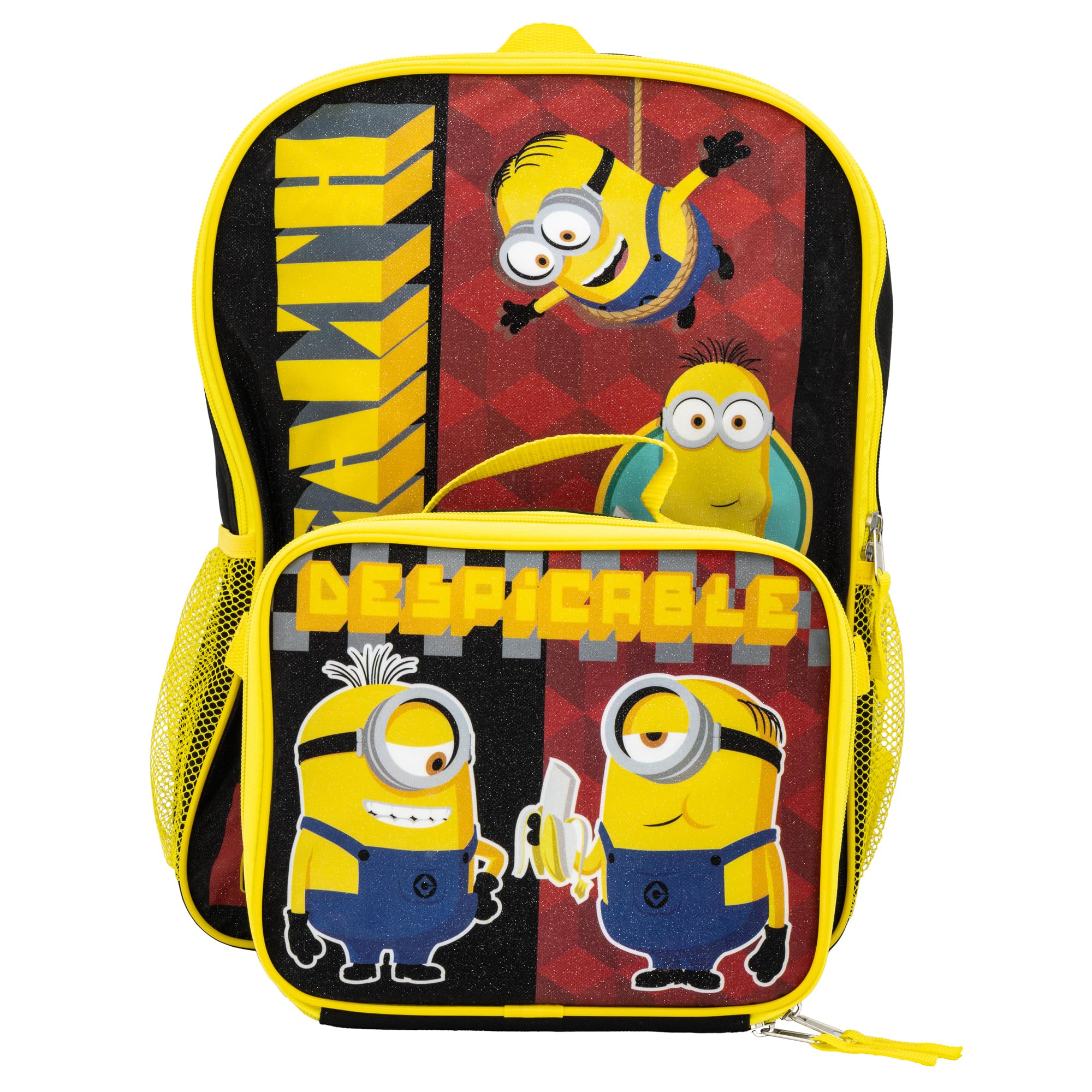2 PC Despicable Me Backpack Set For Kids: Stealth Mode! This Despicable Me backpack set is perfect for kids who love Mionions and is a must have for BACK TO SCHOOL. The set includes a 16 inch backpack and a detachable lunch box and features Kevin, Stuart, Carl, & Tom.