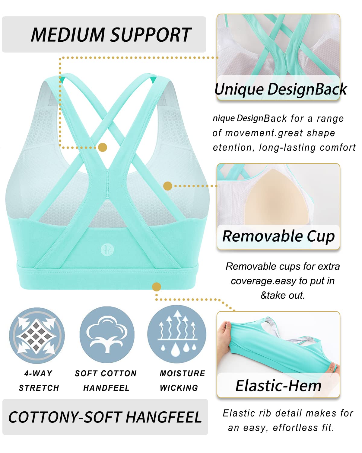 CRISS-CROSS BACK FULL COVERAGE DESIGN:Sexy back bringing more attention to the crisscross double strap back feature.Elastic Double Strap Bra features a sultry full coverage and double layer fabric for enough added support.Stretch Fit Sports Yoga Gym Bra Push up & Padded with removable pads for convenient adjustment, with a cotton-like meterial, soft and comfortable to wear.