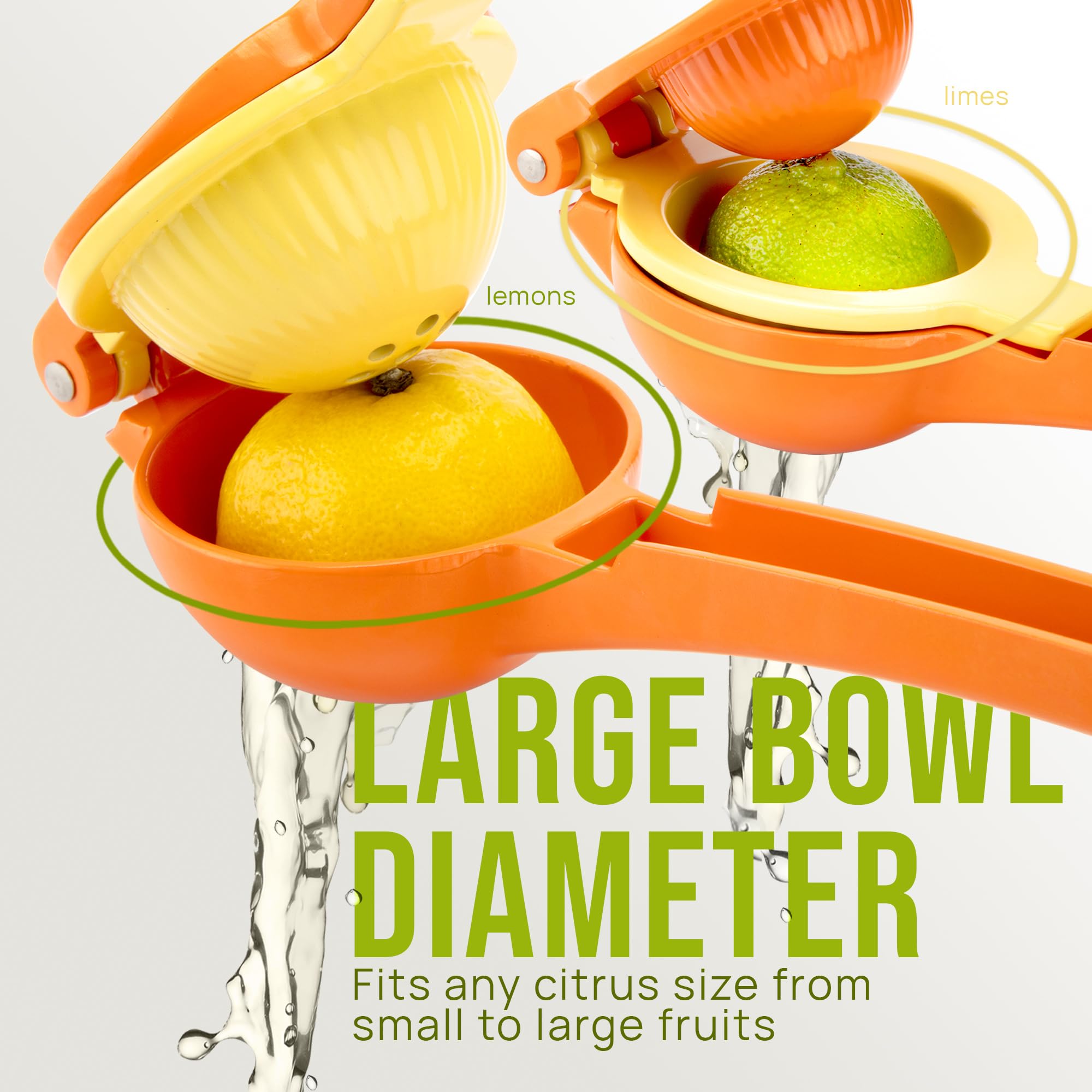 SQUEEZE OUT EVERY DROP OF JUICE: Our 2-in-1 lemon squeezer won’t waste a single drop from your favorite fruit! We have designed this lime juicer to be easy on hands. Watch limes, lemons, and small oranges beg for mercy, even with a soft squeeze. The holes at the bottom of the citrus juicer serve as a seed filter to prevent the pulp and seeds from getting in your way.