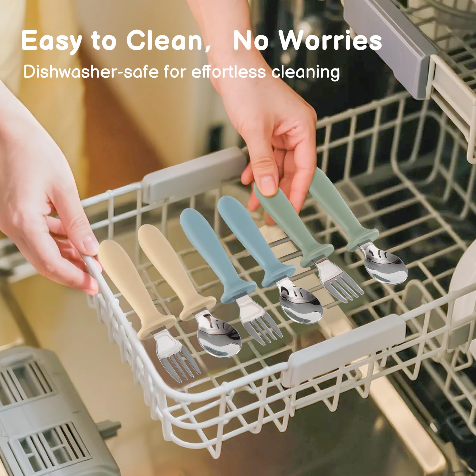 Quality Materials: This toddler spoons and forks set is made entirely of 18/8 stainless steel and food-grade silicone, BPA-free, durable, easy to clean, dishwasher-safe and boil-safe.
