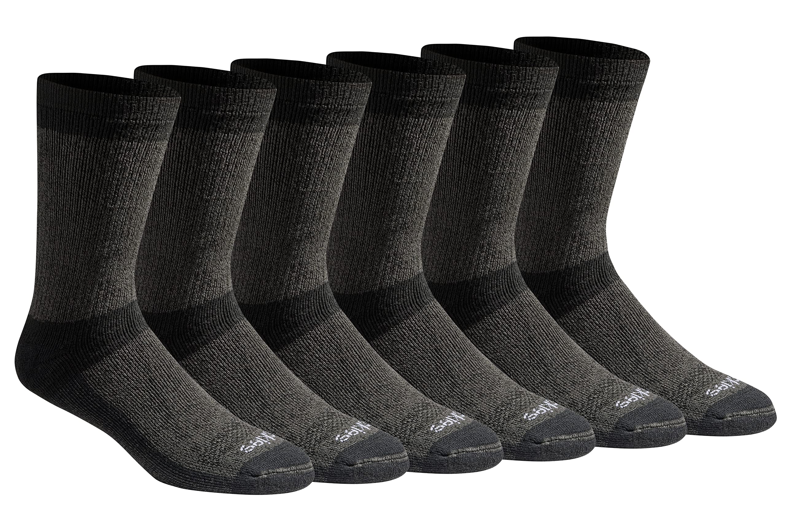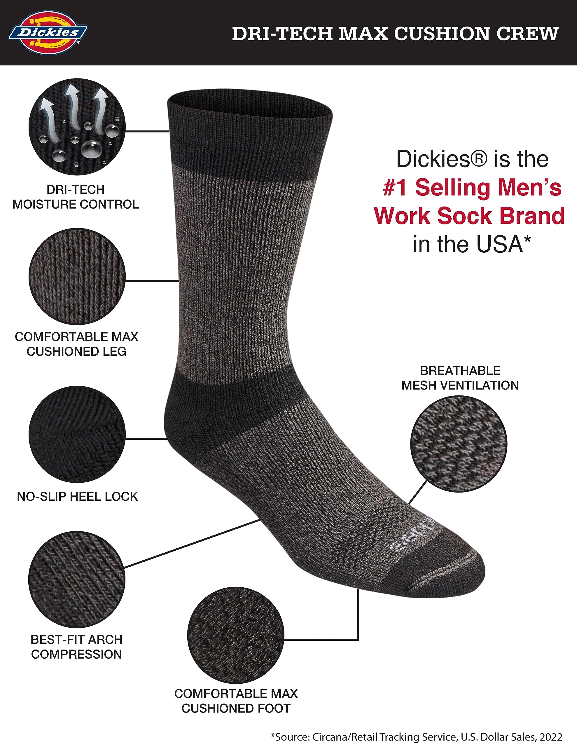 Description Dickies Men's Dri-Tech Max Cushion Crew Socks-performance outdoor Moisture Control crew Socks Multipack with wicking, moisture management fibers keep feet dry, ventilation channels engineered for air circulation and moisture control, arch compression hugs feet and keeps socks in place, while providing in-step support, Reciprocated heel and toe for superior fit and comfort. For Over 100 Years Dickies has been making hard-duty work products built to stand up to whatever life throws at you. Dickies Work Socks are built with purpose to deliver superior comfort and performance on and off the job.
