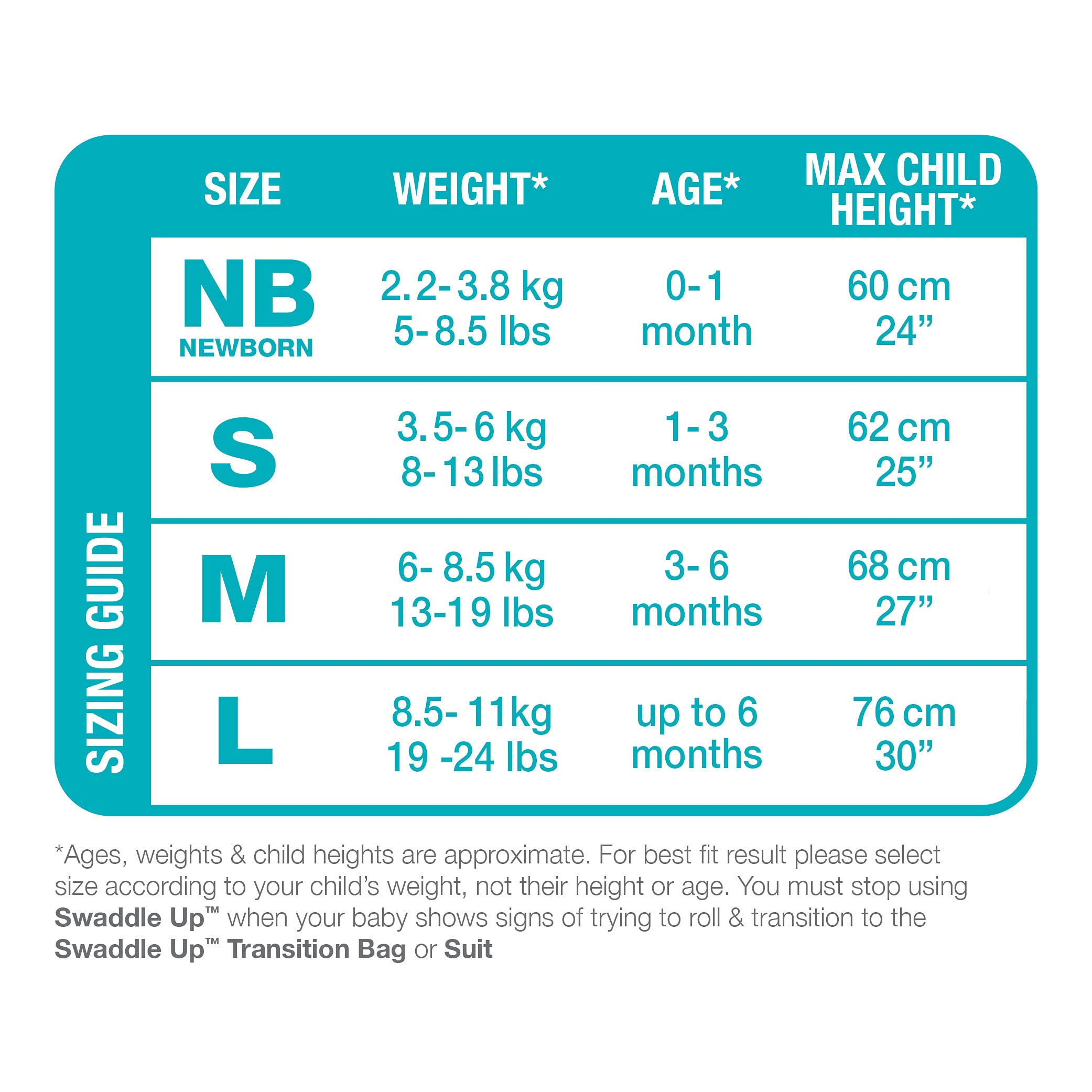 πππππ ππππ = ππππππ πππππ: Choose the SIZE NB (NEWBORN) Swaddle UP baby sleep sack made for 5 β 8.5 lbs, and up to 60 cm / 24 in. Tap the size chart to confirm weight and height, then buy with confidence. The right weight-based fit keeps this arms-up sleep sack snug at the shoulders while hips stay free, stops fabric creeping over faces, reduces returns, and lets every tired parent enjoy longer, safer sleep night after night