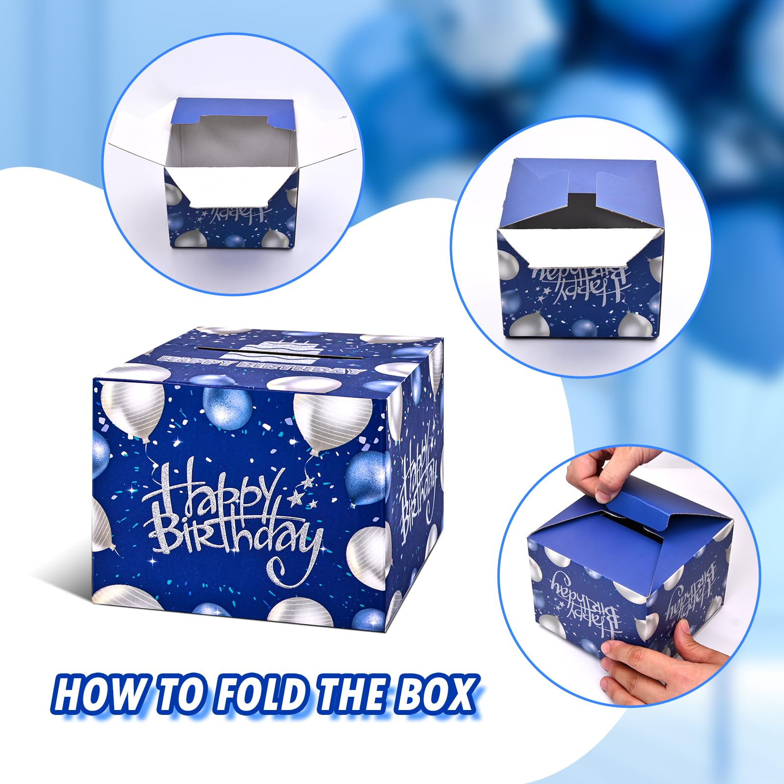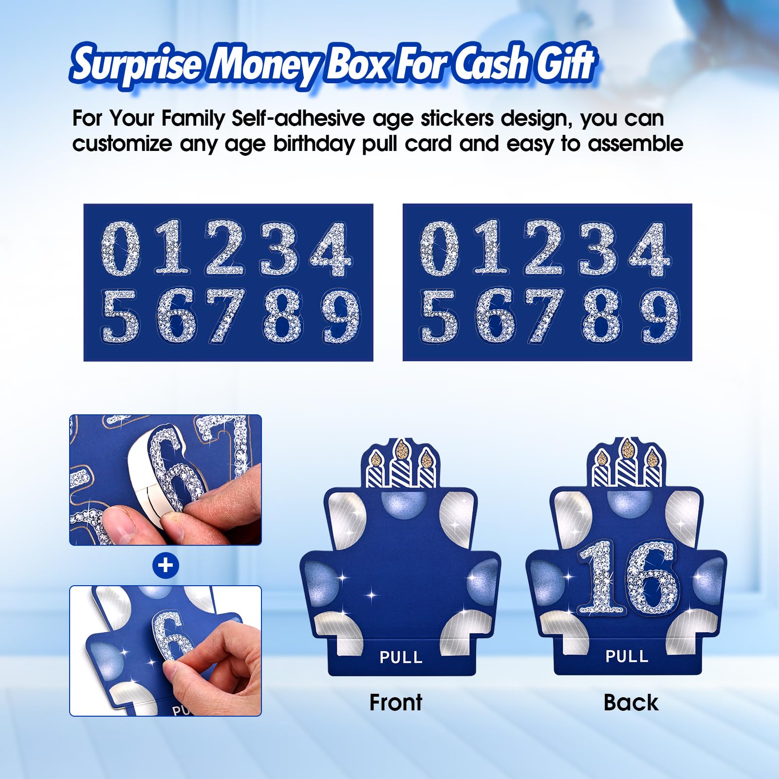Male Birthday Decorations: This items measures 4.12 x 5.12 x 5.12 inches and is made of thick cardboard, making it sturdy and durable. It also includes one birthday cake card (with adhesive dots in the middle) that can stand top of the birthday money box, and 4*self-adhesive age stickers. The product has upgraded the quantity of plastic bags, similar in size to a dollar bill, to 100, satisfying your DIY needs.