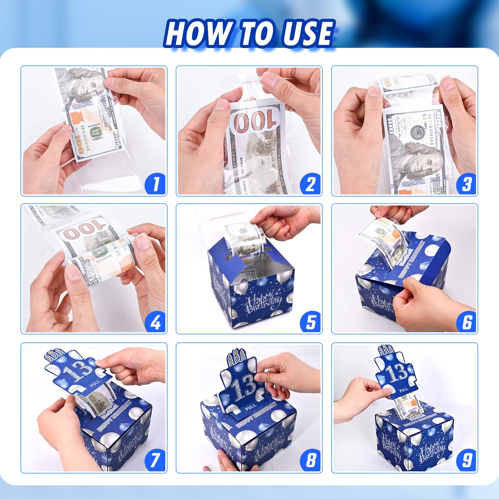 Birthday Gifts For Guys Easy to Assemble : First, put the money in a plastic bag. Second, paste the plastic bag together. Third, roll up the money, put it in the box, and pull out one end of the plastic bag from the drawer slot to paste it with the birthday cake card, and Stick the age stickers on the cake card. then One pull and the money will flow out.