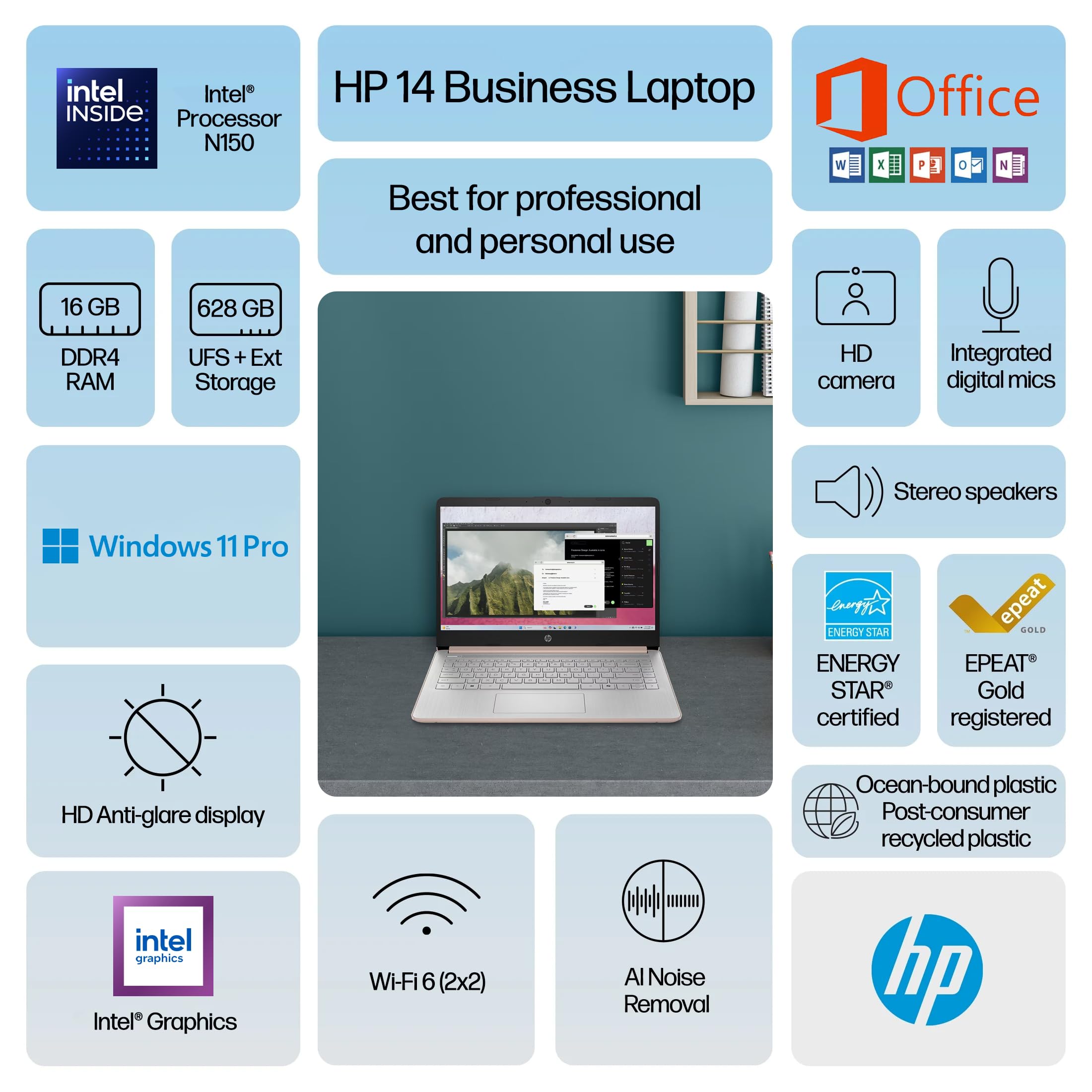 Performance to do more. All-day long. Designed to keep you productive and entertained, this 2025 HP 14-inch laptop PC features Copilot key for AI assistance, long battery life and a thin and portable design. The long-lasting battery life and HP Fast Charge help you stay in the zone longer. Bundle with MarxsolAccessory: 6-in-1 USB-C Docking Station Hub (with USB 3.0, 4K-HDMI, USB-C Connection, SD/TF Card Reader), 500GB Portable Storage Drive, USB extension cord, HDMI cable, mouse pad, and wireless mouse Processor: Quad-Core Intel Processor N150 (Up to 3.6 GHz Max Turbo Frequency, 6 MB Intel Smart Cache, 4 cores, 4 threads) Graphics: Intel Graphics Operating system: Windows 11 Pro Software: Free Lifetime Microsoft Office 2024 Memory: 16GB DDR4 Storage: 628GB (128GB UFS + 500GB External Drive) Display: 14-inch diagonal, HD (1366 x 768), micro-edge, anti-glare, 250 nits Connectivity: Wi-Fi 6 and Bluetooth 5.4 combo Audio: HD Audio with stereo speakers Keyboard: English, natural silver keyboard Webcam: HP True Vision 720p HD camera with temporal noise reduction and integrated dual array digital microphones Ports: 1x USB Type-C 10Gbps signaling rate (supports DisplayPort 1.2) 2x USB Type-A 5Gbps signaling rate 1x Headphone/microphone combo 1x AC Smart pin 1x HDMI 1.4b Battery: 3-cell, 41 Wh Li-ion battery, Up to 9 hours Color: Rose Gold Dimensions (W x D x H): 12.76 x 8.86 x 0.71 in Weight: 3.24 lbs