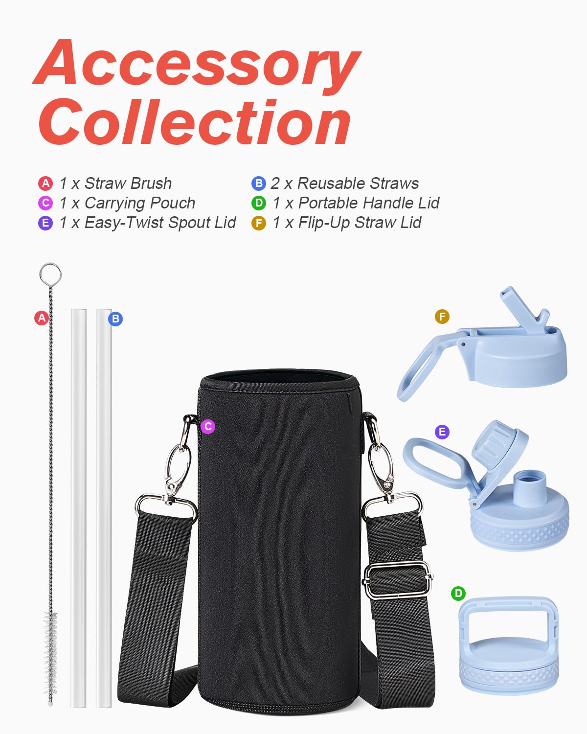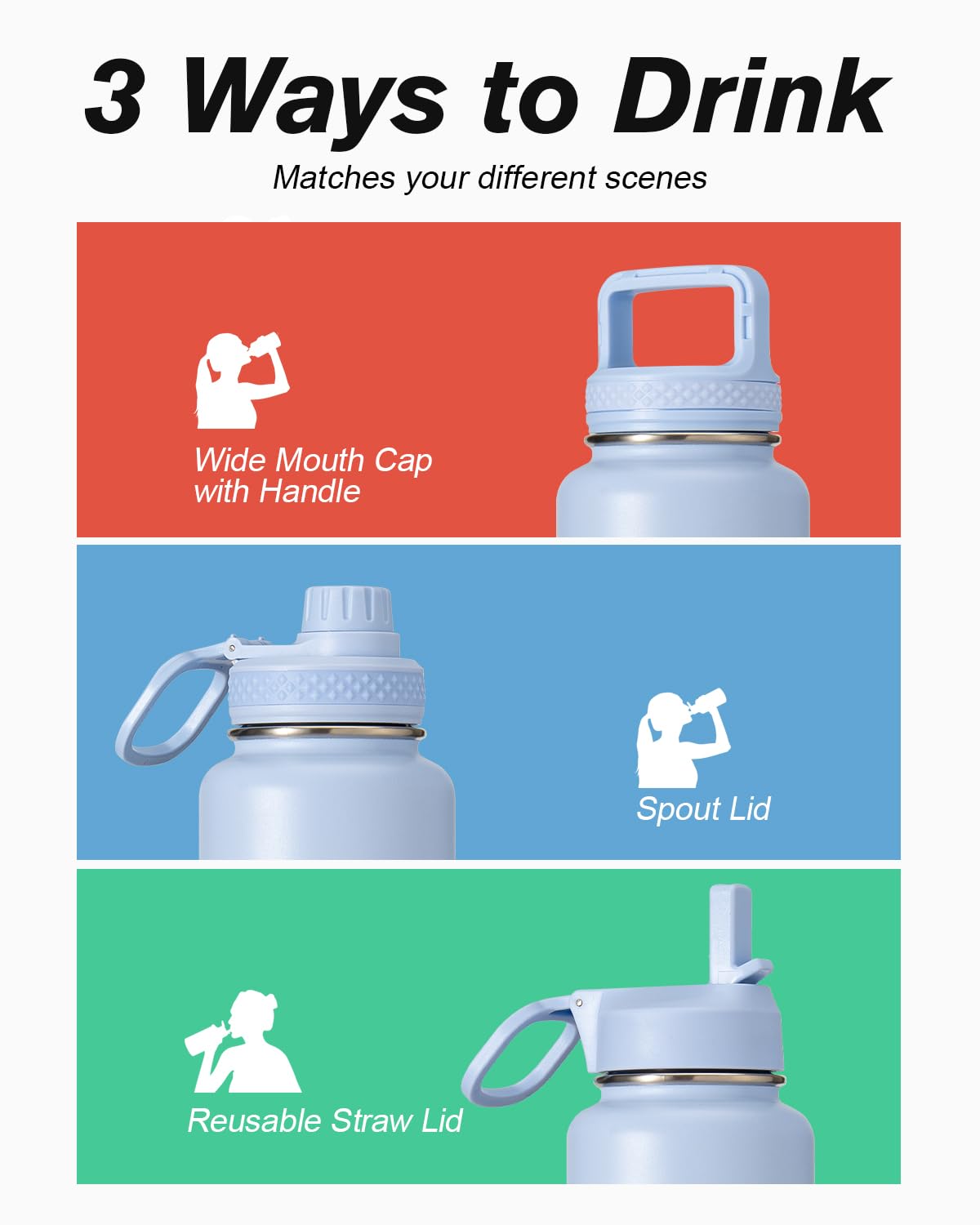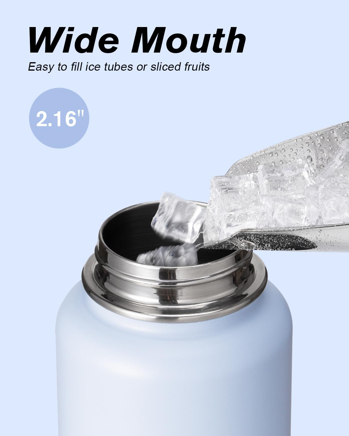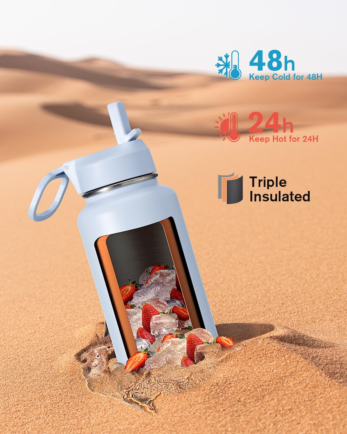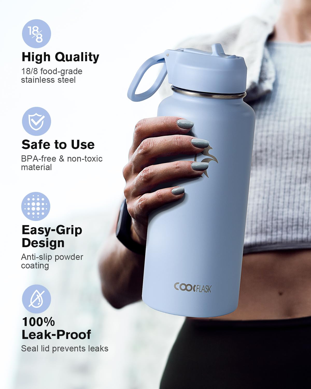 Water Bottle 32 oz Insulated with Straw, Coolflask Stainless Steel Metal 3 Lids Water Flask Wide Mouth for Sports or Office, Non-BPA Keep Cold Up to 48 Hrs or Hot Up to 24 Hrs, Light Blue