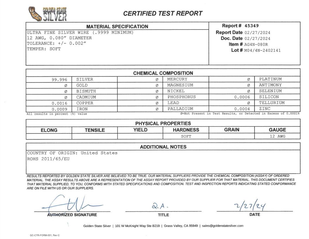This is a 5-inch Rod Set of MINIMUM 99.995% Pure Silver Wire in 12 Gauge (0.080 in. / 2.03 mm). These silver wire rods are ideal for use in your home Colloidal Silver Generator or DIY set-up. Custom-annealed to "Soft" temper making it easy to work with by hand--straighten and/or bend as needed while still maintaining form. Guaranteed to be MINIMUM 99.995% Pure Silver, OR BETTER. This means even FEWER impurities than your standard 99.99% Silver. A copy of the Certified Test Report is included with every order, outlining the chemical composition (assay) of the silver, and the lot that it came from. You won't find a more trusted source for pure silver wire for colloidal. All of our silver is SOURCED, MANUFACTURED, SOLD, SHIPPED, and PACKED, right here in the UNITED STATES. We (Golden State Silver) have been supplying the highest quality, purity, and customer satisfaction for over 15 years. Come see why; Find Your Golden State