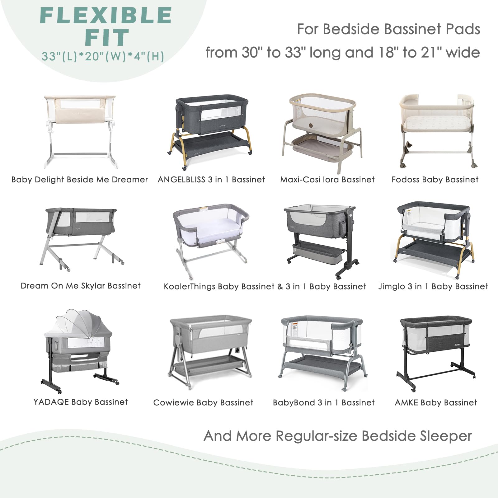 FLEXIBLE FIT - These rectangle bassinet sheets measure 33x20 inches and made specifically for most regular-sized bedside sleeper such as Baby Delight Beside Me Dreamer, Dream On Me Skylar, Maxi-Cosi Iora, Angelbliss 3 in 1 baby bassinet,KoolerThings/Fodoss/Jimglo/BabyBond/YADAQE baby bassinets bedside sleeper. With an elastic band around the bottom edge of each sheet to ensure a snug fit, these bassinet mattress sheets are flexible fit pads from 18" to 21" wide and 30" to 33" long