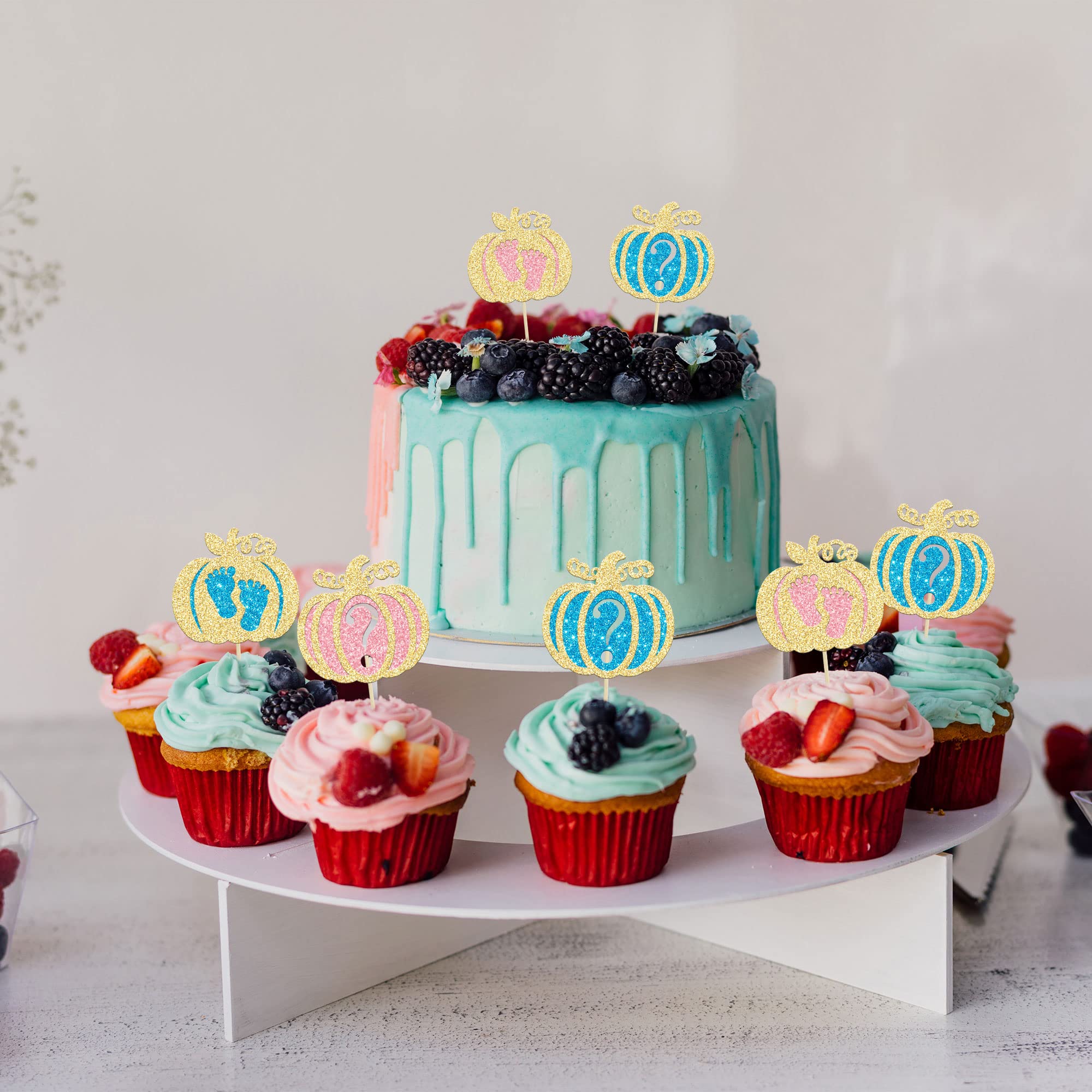 🍰【No Assembly Required】: 24Pcs Pumpkin Gender Reveal Cupcake Toppers can put in the cake directly! These 24Pcs Pumpkin Gender Reveal Cupcake Toppers save your time and super easy to use. You can easily dress up your Pumpkin theme cakes, yes! but don't stop there, put them into desserts, cookies, fruit pieces, appetizers, muffins and so much more!