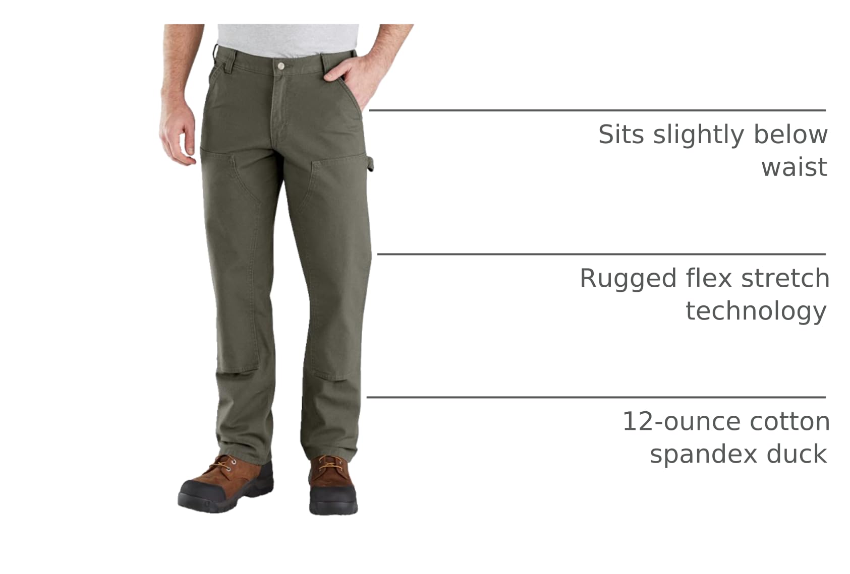 Description Built with stretch and a relaxed fit, these double-fronts make it easy to move through your workday. 12-ounce, 99 percent cotton/1 percent spandex duck • rugged flex durable stretch technology for ease of movement • sits at the waist • relaxed seat and thigh • double front with cleanout openings that accommodate knee pads • multiple tool pockets • left-leg hammer loop • stronger sewn-on-seam belt loops • heavy-hauling reinforced back pockets • straight leg opening fits over boots • imported