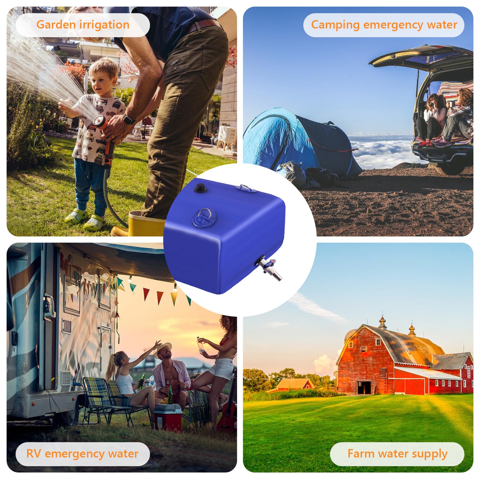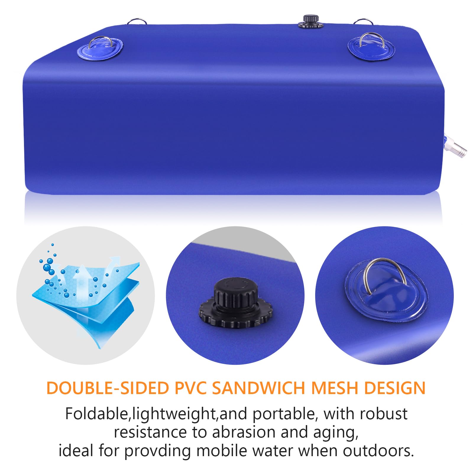 POTABLE WATER STORAGE BLADDER: A portable water tank quickly fills with water using the bladder's 1.5-inch wide opening. Outlet valve 3/4 spout, stainless steel material is strong and durable. Portable water storage has a convenient outlet valve on/off switch for easy access to water and provides you with emergency water storage.