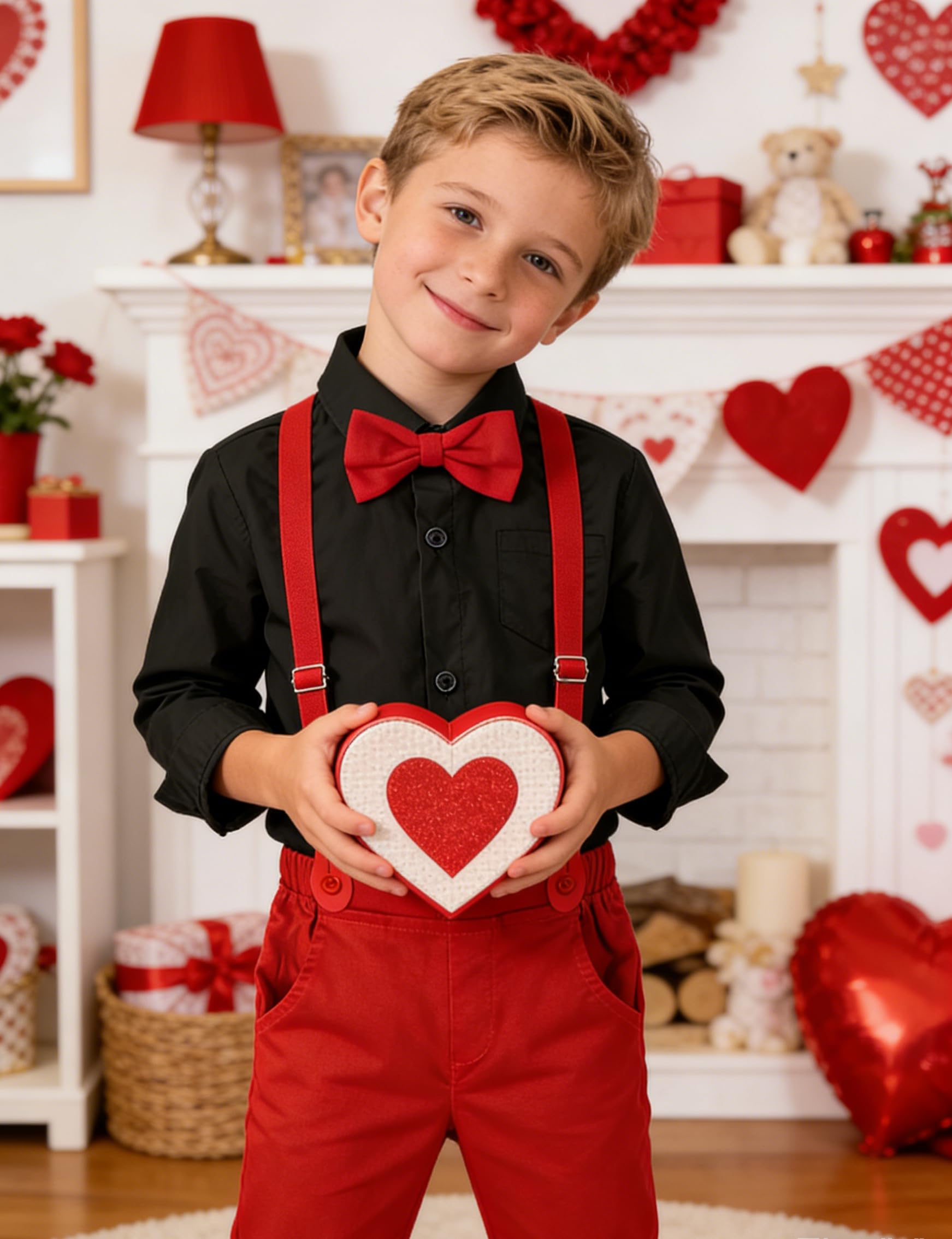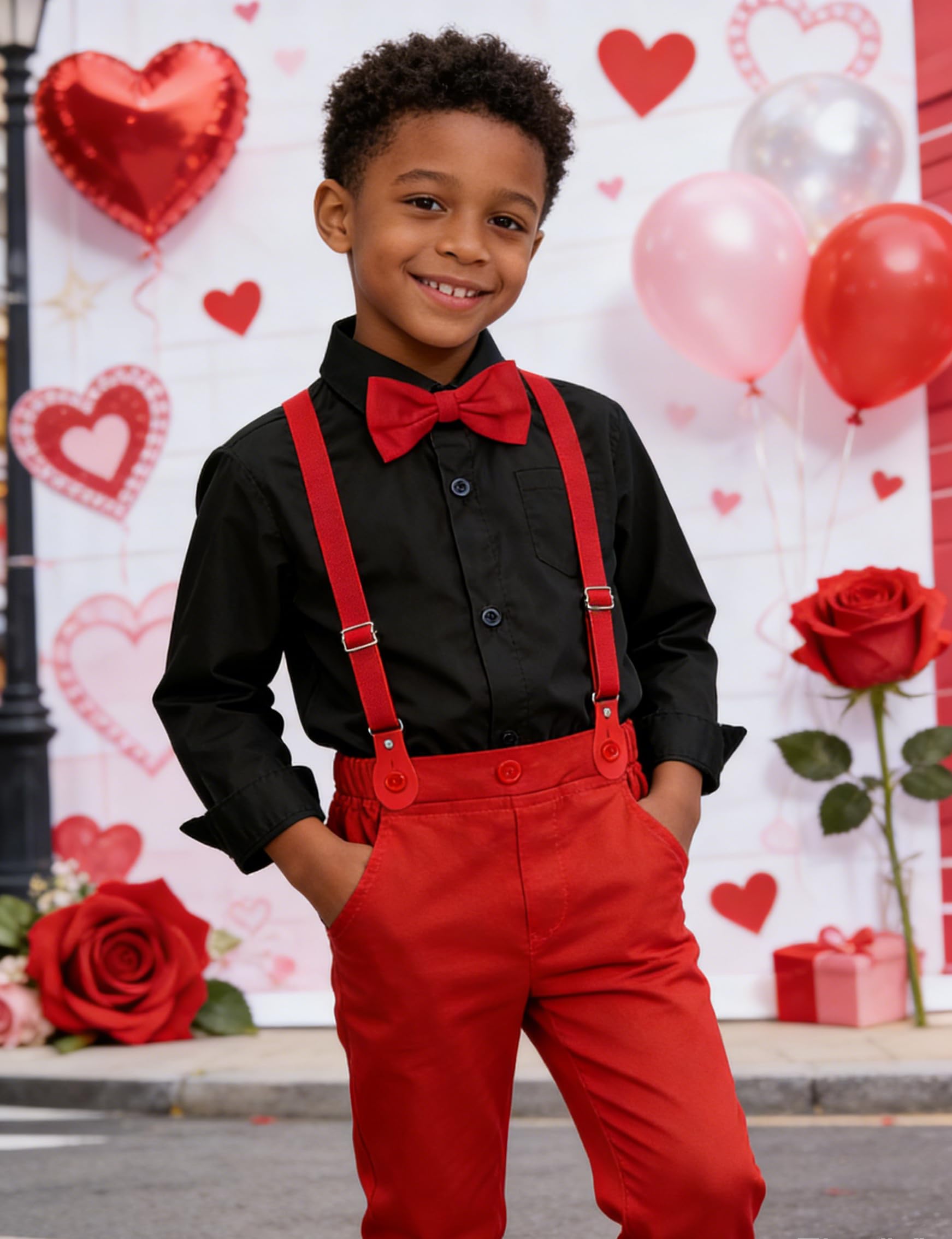 Toddler boy dress outfit consists of long sleeve dress shirt, elastic-waist pants, detachable bow tie and stretch suspender.