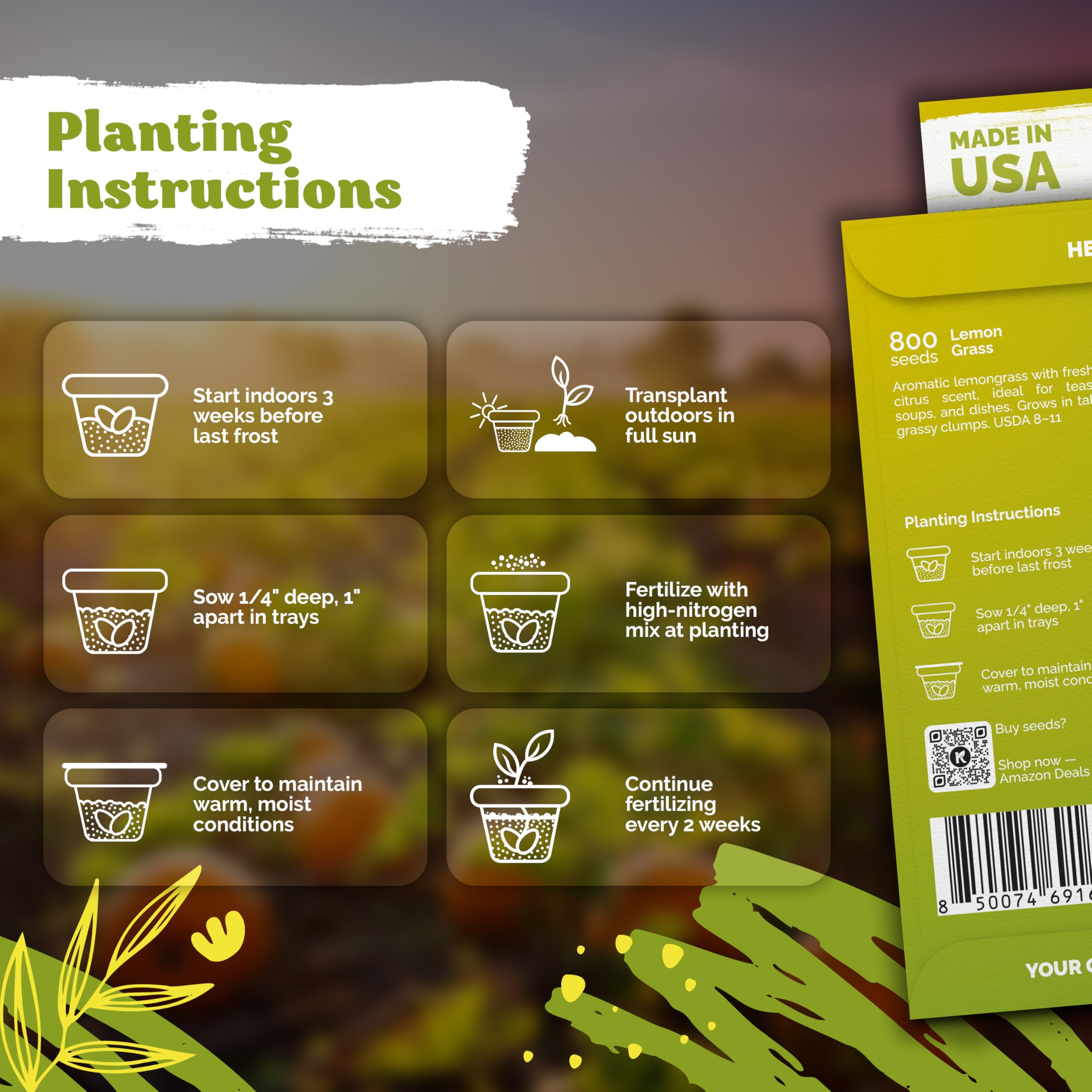 High Germination & Vigor: lemon grass seeds sprout in 5–21 days at 75–86°F; perennial lemongrass plant forms clumping leaves; ideal heirloom seeds for kitchen herb garden and outdoor beds, USDA 8–11.