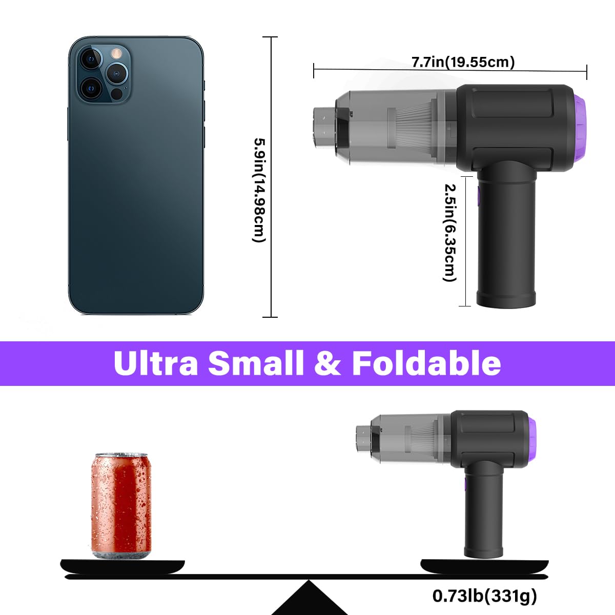 【Smaller size, Stronger suction】 The computer cleaner has a length of 7.67in, a diameter of 2.5in and a weight of 0.73lb, but it’s motor has 80W power and can provide 14500pa cyclone suction, can capable of 110000rpm.Simply turn on the power and you can switch between 3 different air speeds with button.