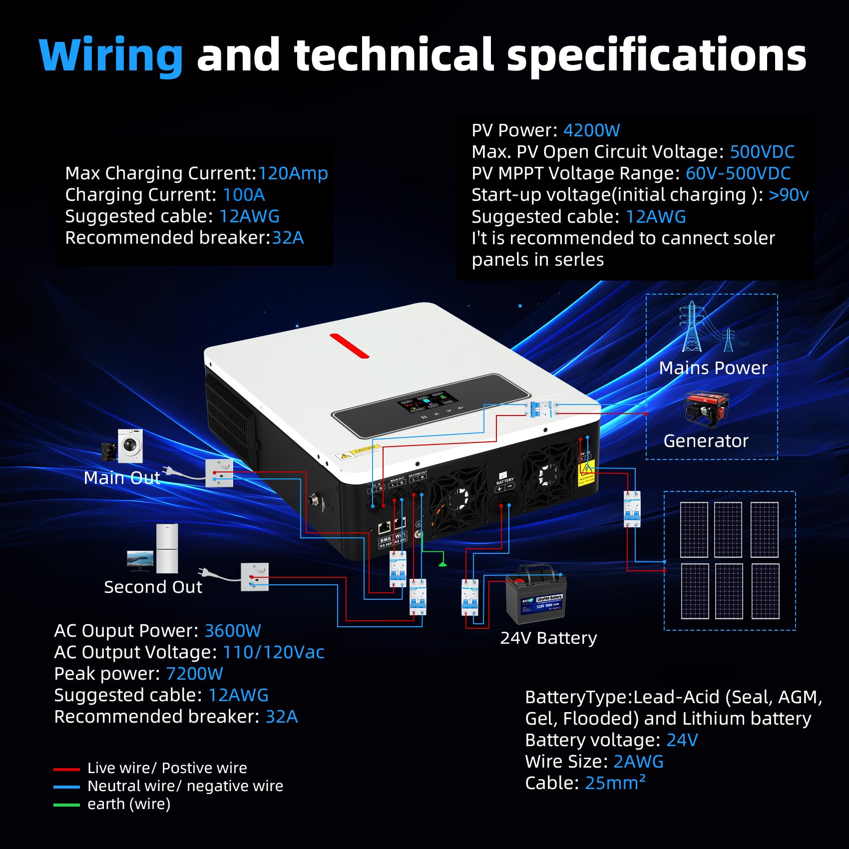 Technical Specifications: Hybrid inverter with Max pv array power of 3600W, peak power 4200W, Max dc voltage 500VDC , Max ac input current 40A, nominal input frequency 60HZ, charge current 120A, handling high-power demands with ease. Suggest pv and ac cable size: 12AWG
