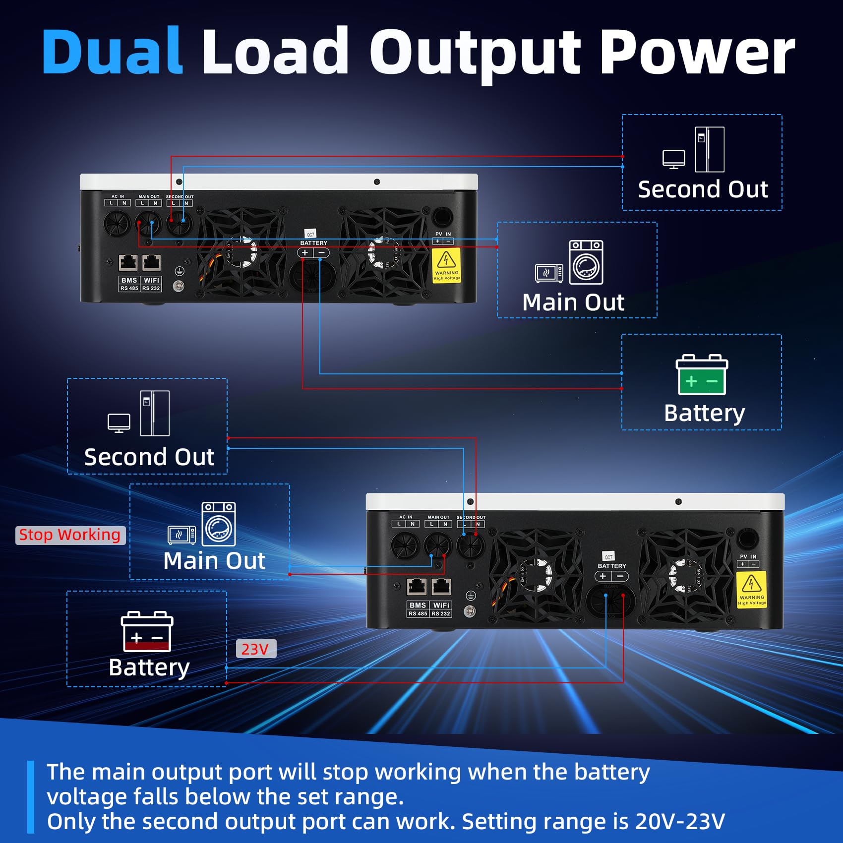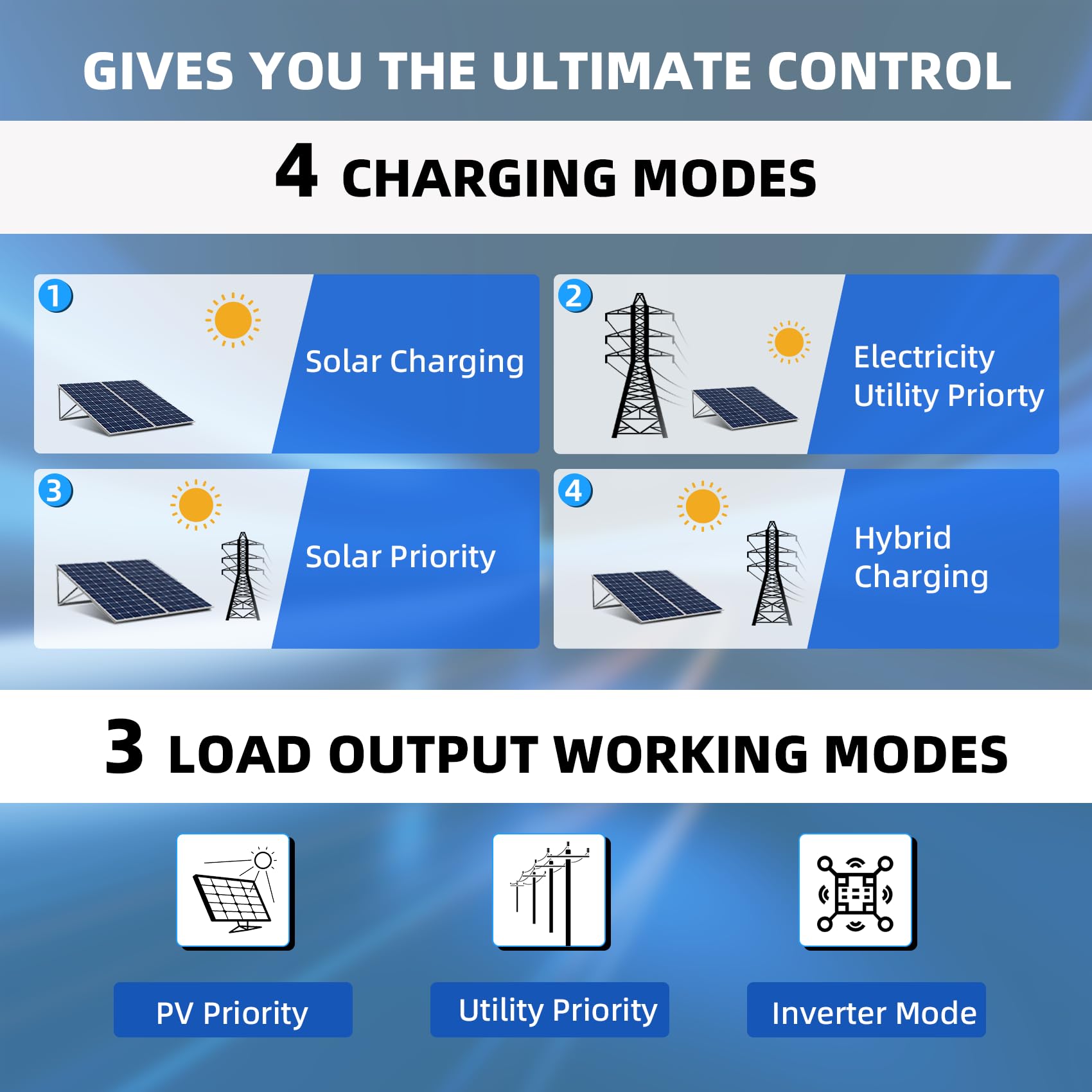 Diverse Charging & Output Modes: Hybrid solar inverter has 4 charging modes to choose from solar, mains first, solar first, and mains & solar hybrid charging. 3 output modes: solar first, mains first, and sbu priority, that's ensures an uninterrupted power supply. Hybrid inverter can work with mains voltage or generator power, auto-restarting when ac recovers