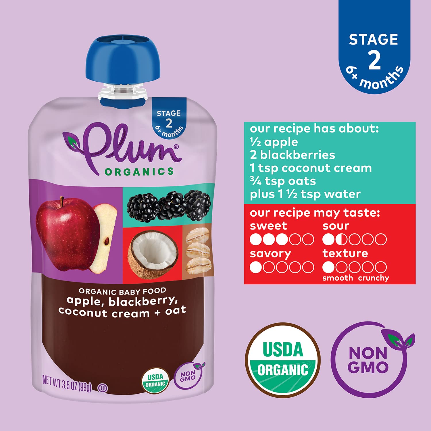 Baby Food for your Little Foodie. Plum Organics Stage 2 (6+ months) organic baby food pouches are made with blends of fruits, veggies, and ingredients that are perfect for exposing your little foodie to unique flavors, textures, and colors. Our Apple, Blackberry, Coconut Cream, and Oat blend is made with non-GMO, organic ingredients for organic baby food that your baby will love. Plum Organics pouches are naturally preserved, unsalted, unsweetened, and kosher parve. And since our baby food pouches are convenient, portable, and resealable, you can customize portion sizes, whether you're at home or you need a simple snack on the go.
