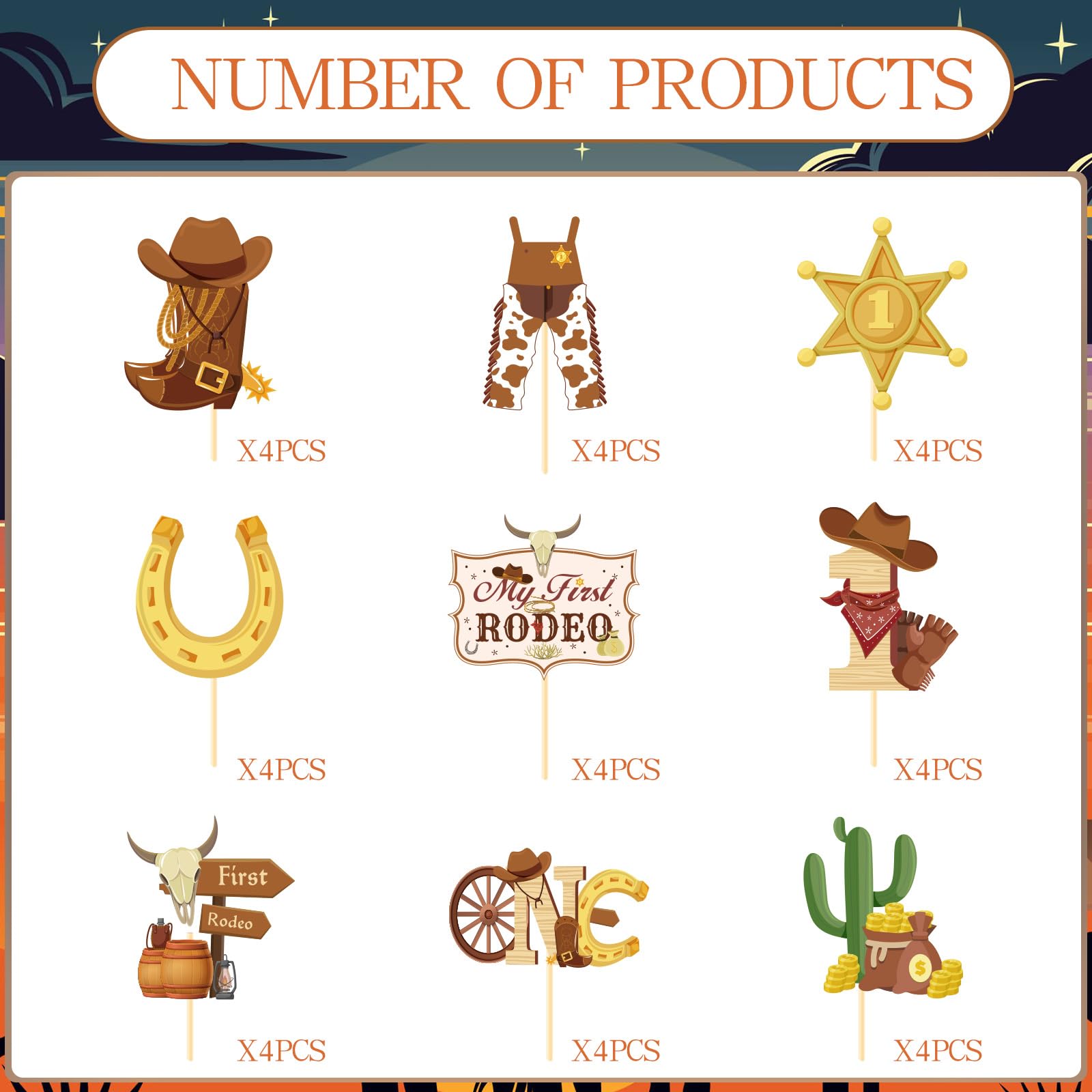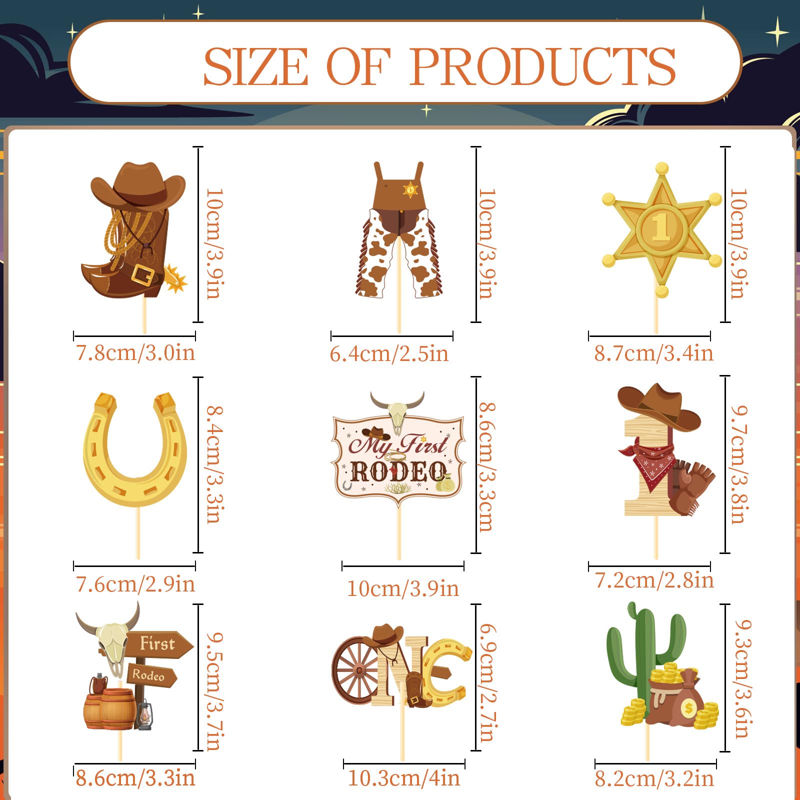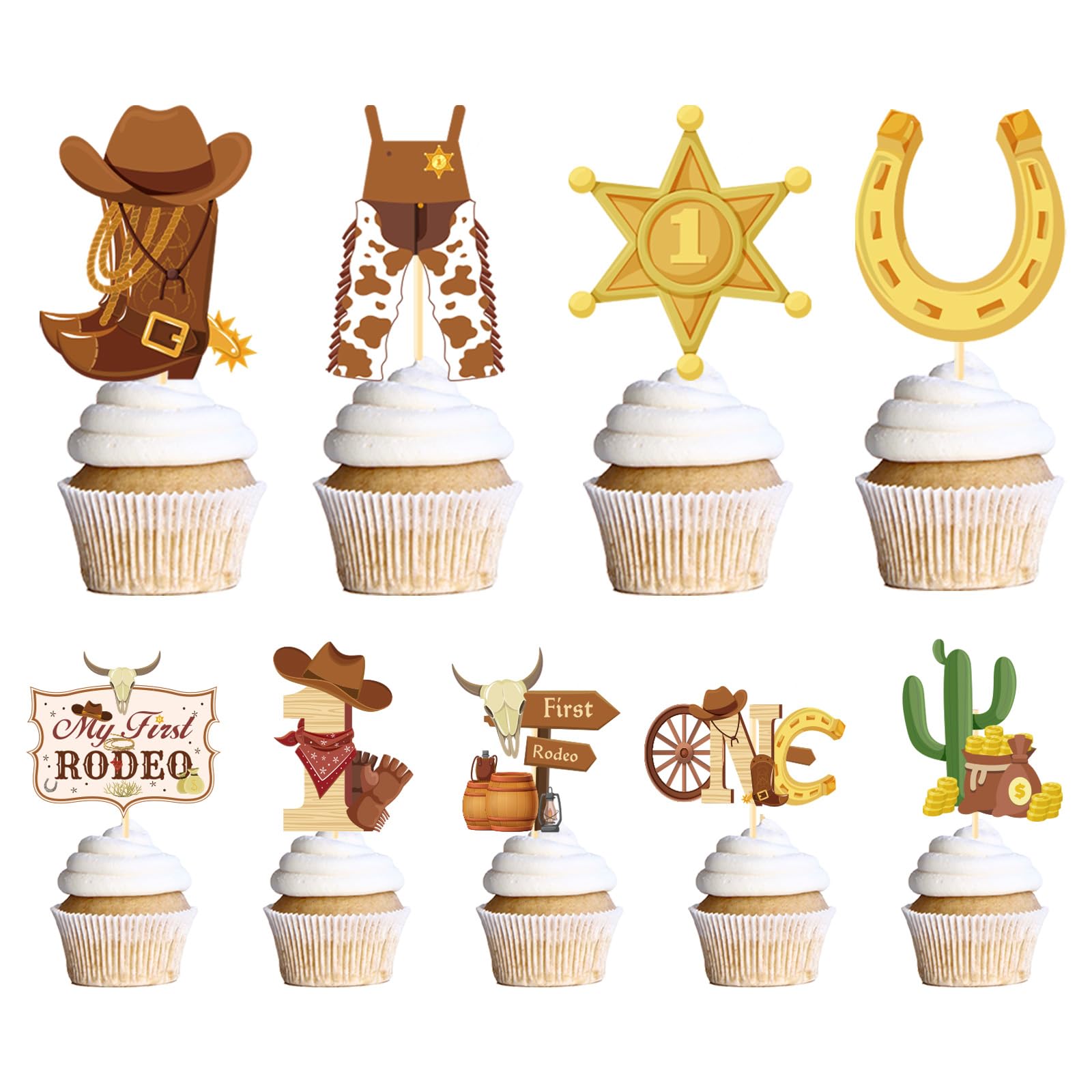 First Cowboy Cupcake Toppers: The cowboy cupcake toppers decorating set contains 9 different designs of western cowboy cupcake toppers, 4 pieces of each design for a total of 36 pieces to fit most cupcakes. With the western cowboy cupcake 1st year cake decorating set, every guest can revel in the joy of sending special wishes to the little cowboy!