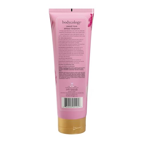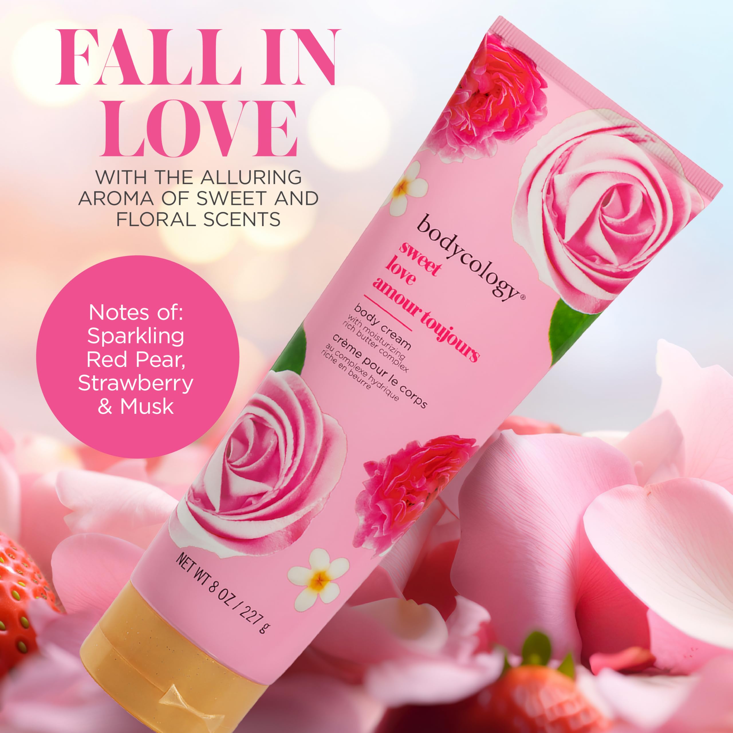 Experience the ultimate treat for your skin when you moisturize daily with Bodycology Sweet Love Shea Butter Body Cream. Designed to pamper your skin with the delicate fragrance of water lily and sweet rose. Your skin will thank you for using ultra-hydrating and non-greasy shea butter, cocoa butter, and jojoba oil. When you lather your skin in our Sweet Love Cream, you’ll fall in love with the delightful blend of cherry, sparkling red pear, and luscious strawberry notes. As you indulge in the creamy base of amber, sandalwood, and musk, you’ll be transported to a dreamy paradise. Use this fragranced cream as a form of special self-care or make it a part of your daily beauty ritual. You can layer this scent with the Bodycology beauty products you love like the matching Sweet Love Fragrance Body Mist or with our other body sprays to create your own signature scent. All Bodycology products are paraben, phthalate, and cruelty-free.