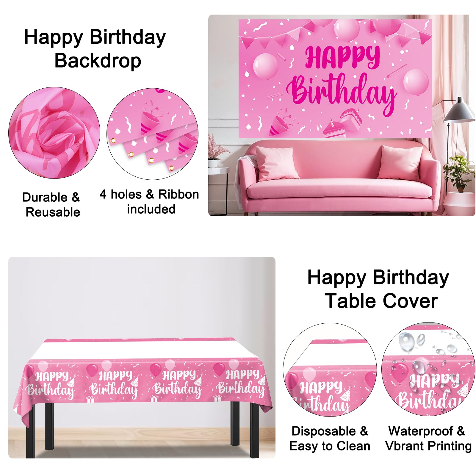 Happy Birthday Backdrop and Table Cover --- Birthday backdrop is made from polyester fabrics, sturdy, lightweight, no-fading, and reusable. The table cloth is waterproof and disposable. Vibrant printing with birthday elements patterns of "happy birthday", cake, balloons, birthday hats, presents...adding sweet, cheerful and romantic vibe to birthday party.