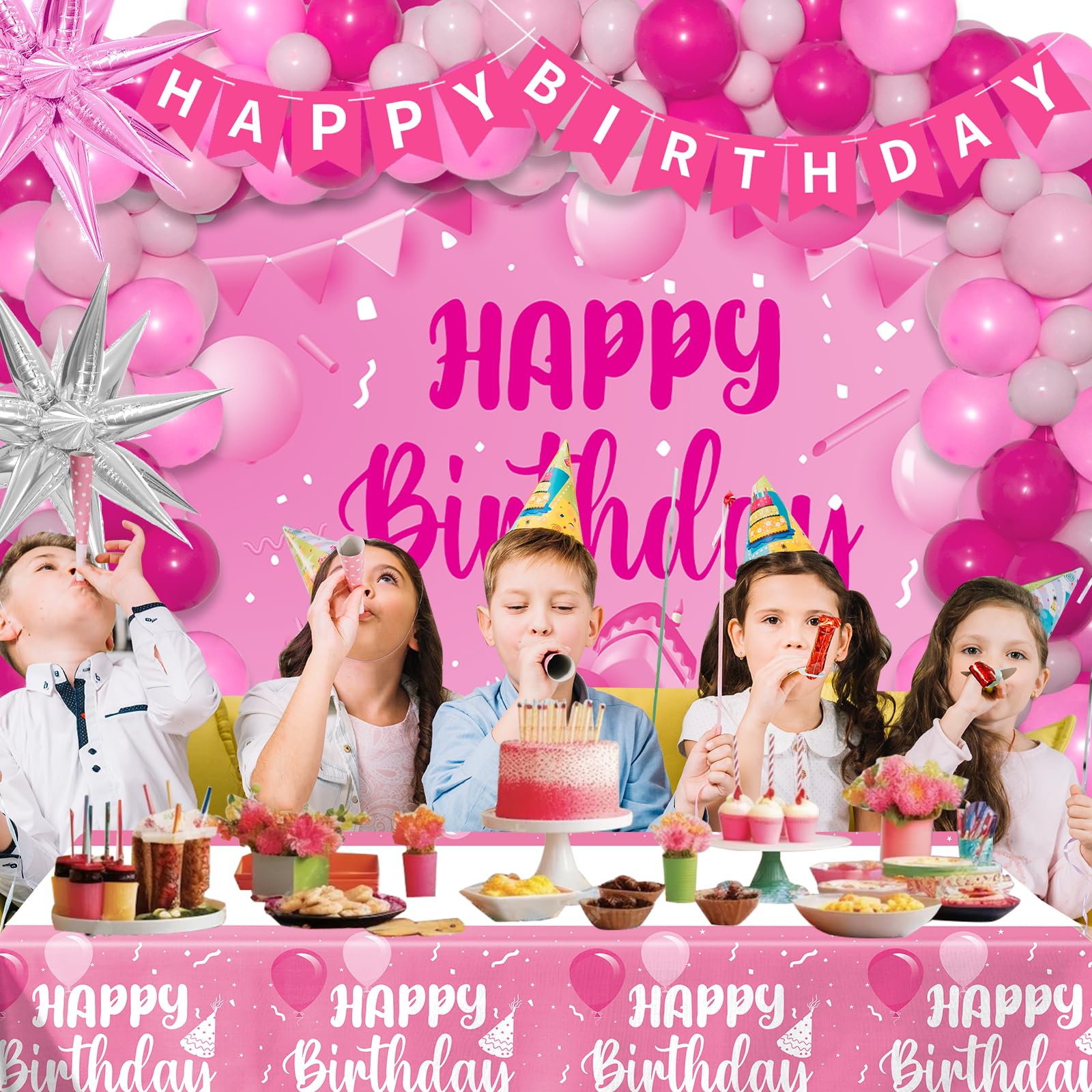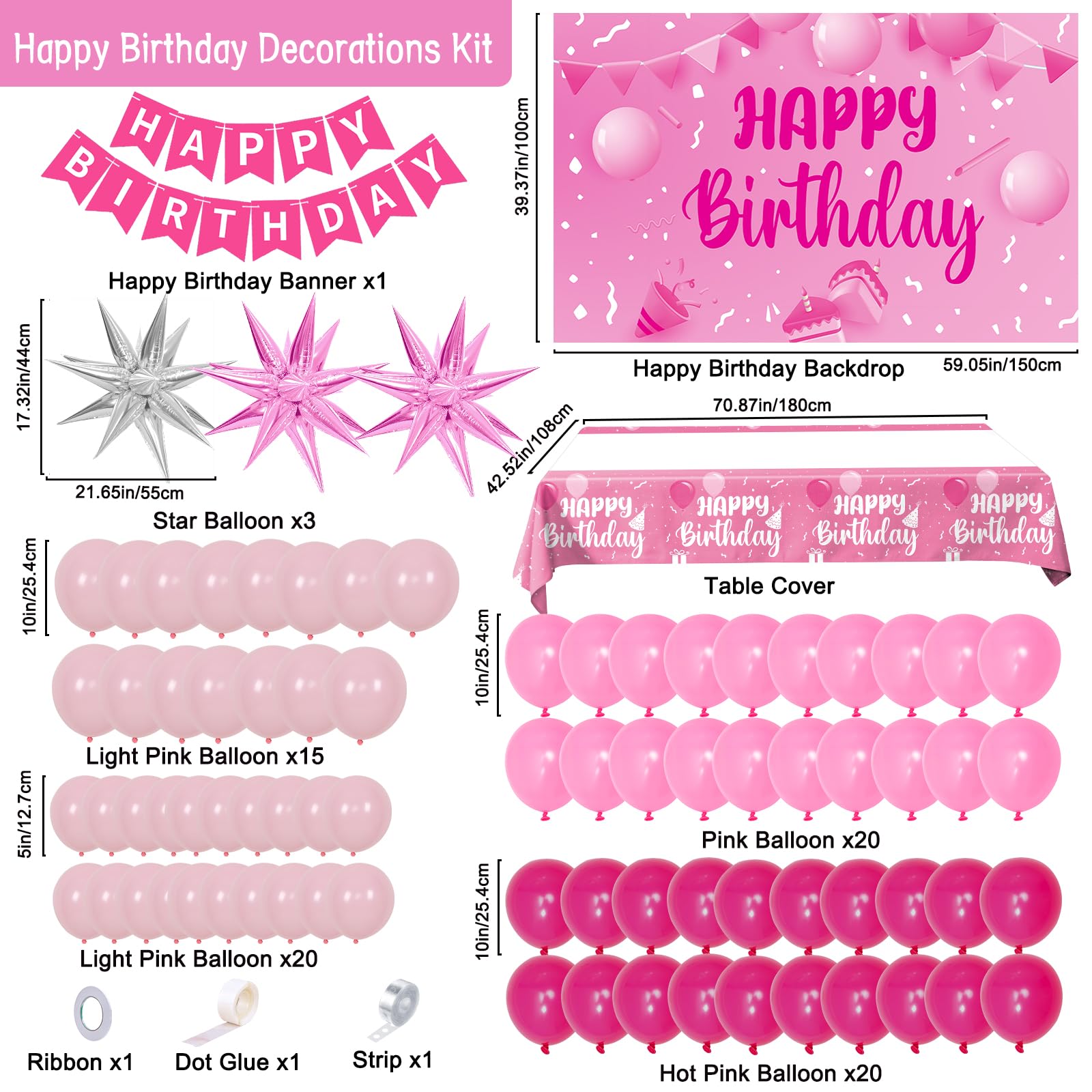 Hot Pink Birthday Decorations--- Includes 10" latex balloons 55pcs ( pink balloons 20pcs, hot pink balloons 20pcs, light pink balloons 15pcs), 5" light pink balloons 20pcs, pink happy birthday banner 1 set, pink birthday backdrop cloth 59.1 x 39.4in (150x100cm), pink and silver star balloons(55x44cm), pink happy birthday table cover, sticky dots, strip and ribbon.